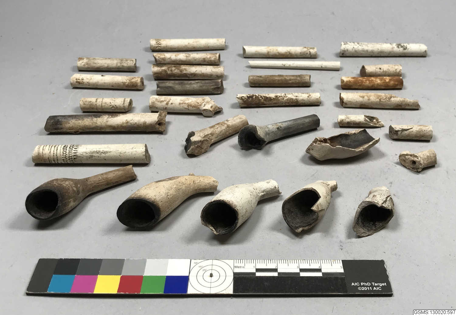 Kritpipor, fragment; tio holkfragment samt en mängd skaftdelar