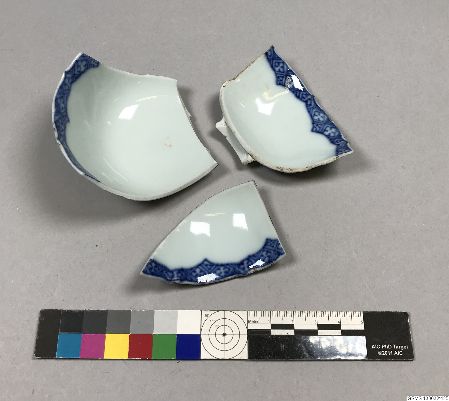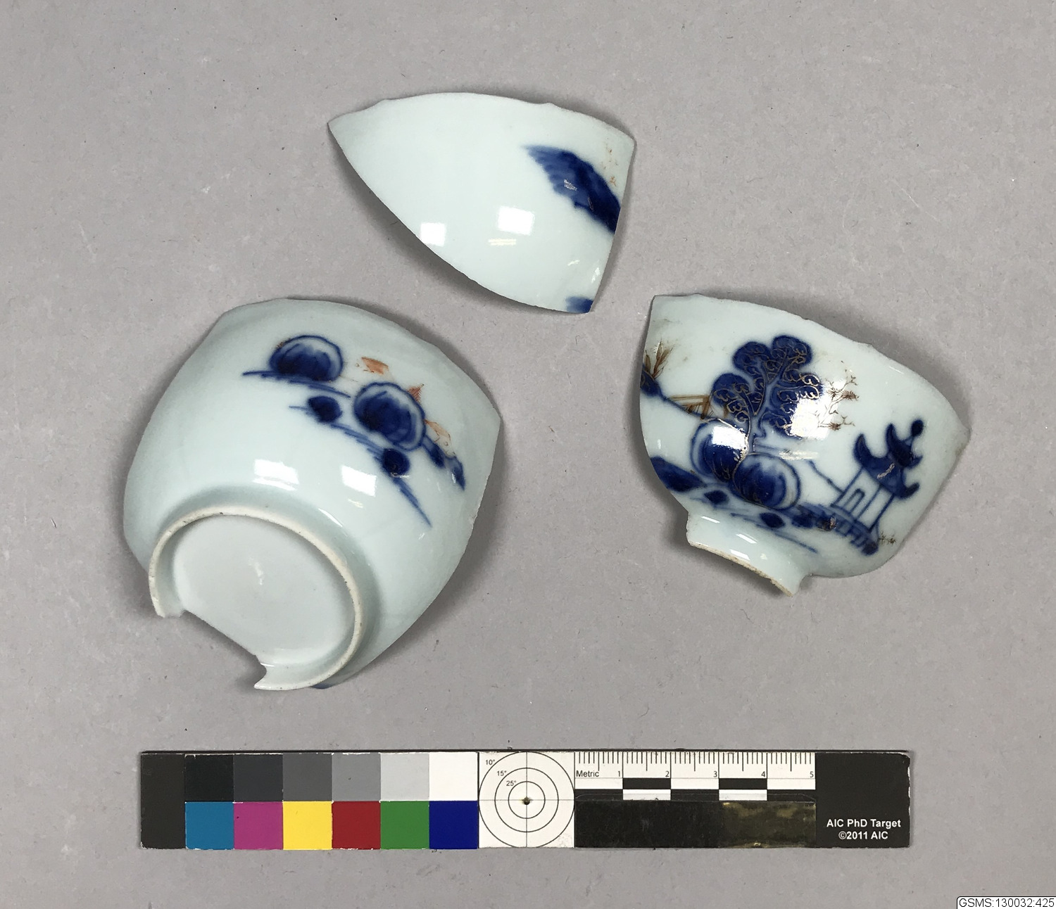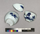 - tre skärvor av kopp med kinesiskt hus på en av dem