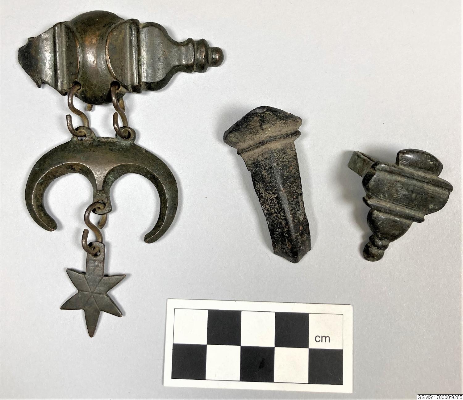 Hängsmycke av brons, bestående av 3 delar, förbundna genom 3 s-formiga krokar, Andra bronsföremål