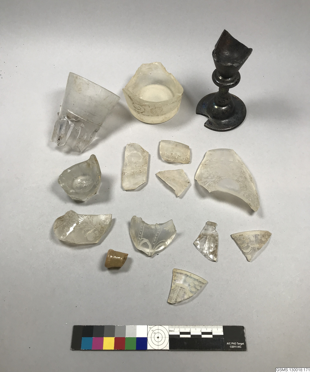 mörkt vinglas samt vita skärvor av vas, liten flaska, dricksglas