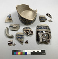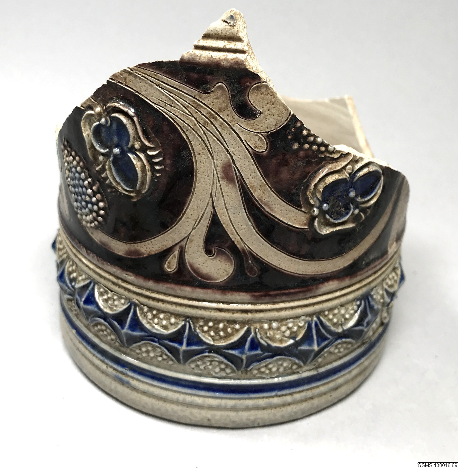 Krus i grått, blått och plommonbrunt, Westerwaldtyp. Tolv skärvor varav en större bottendel.