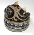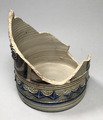 Grålilablåglaserat stengods, fragment; Krus i grått, blått och plommonbrunt, Westerwaldtyp. Tolv skärvor varav en större bottendel.