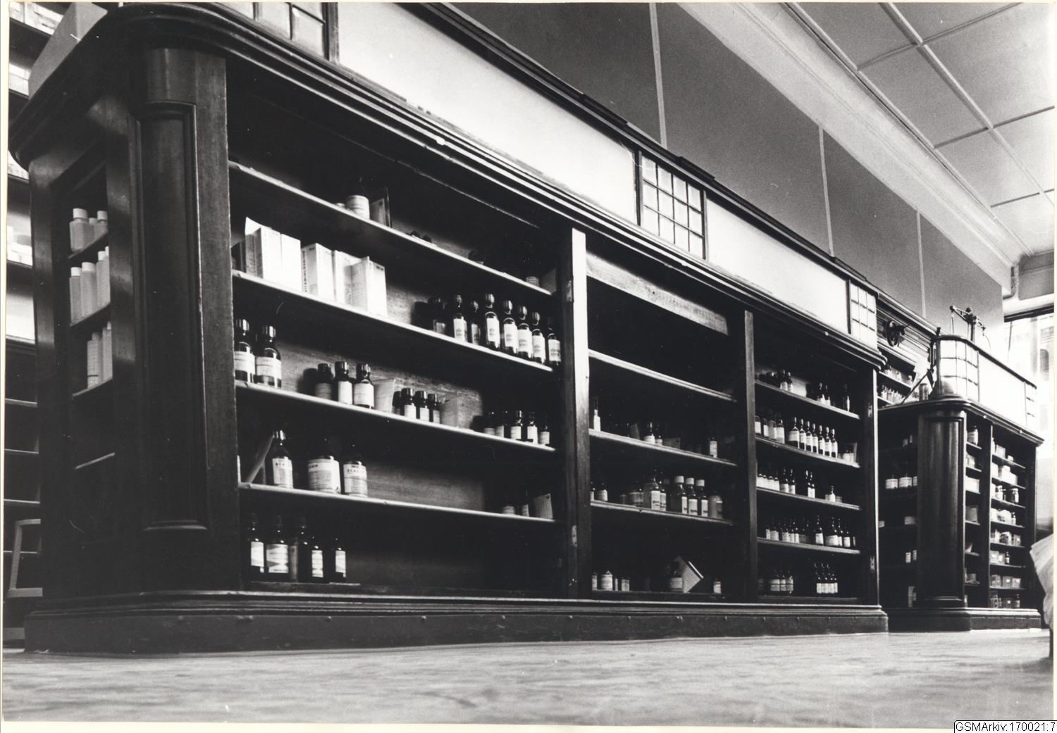 - Butiksdisk med diverse produkter i apoteket Enhörningen. Fotot taget innan flytt ur lokalen 1968.