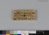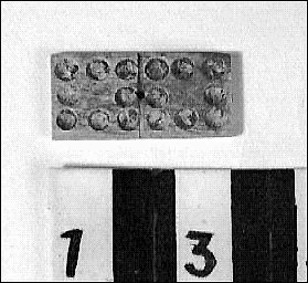 Spelbricka i ben el. benhorn. Indelad i två fält med 8 prickar, försänkningar på varje fält. Ett litet borrat hål i mitten.