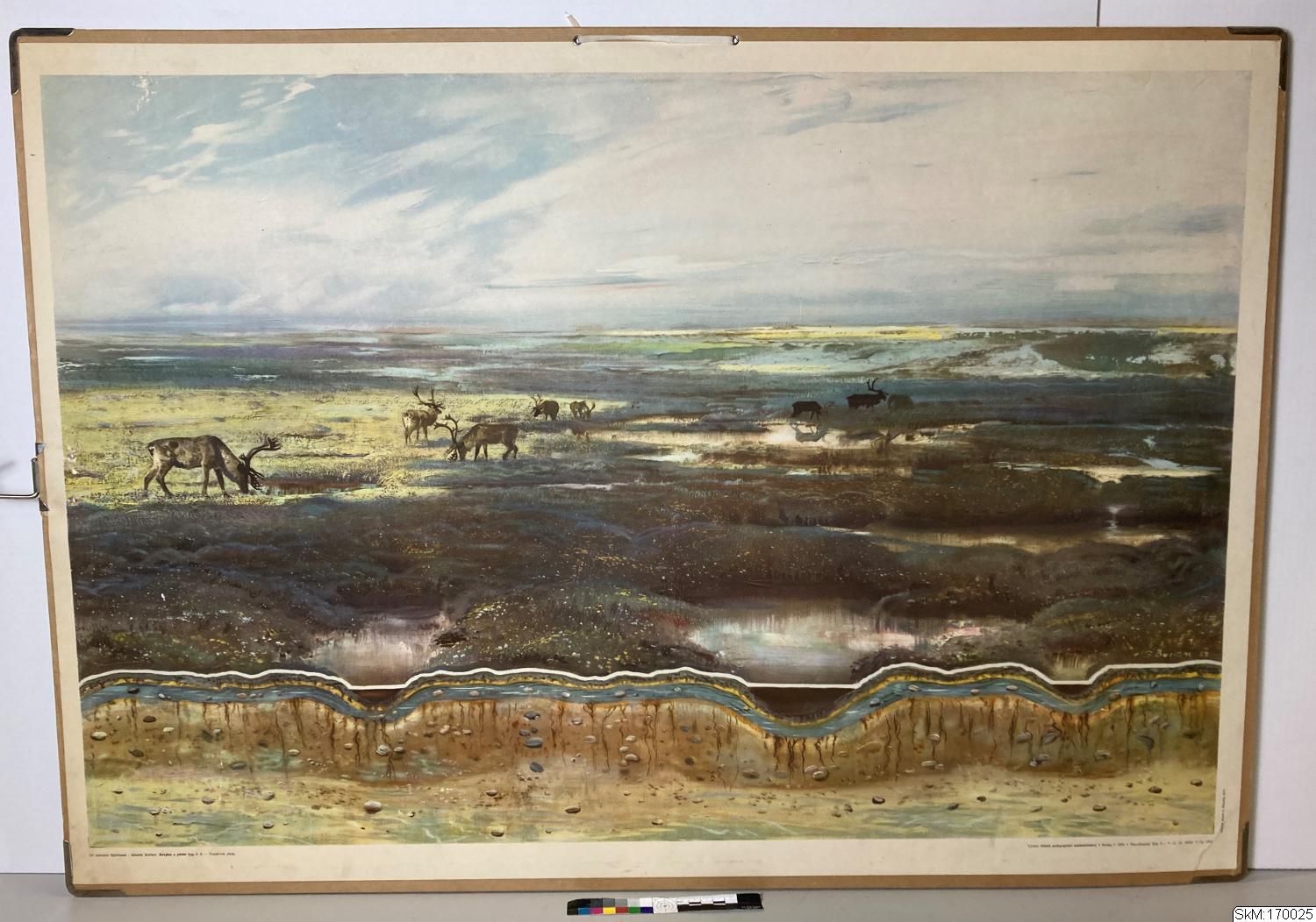 Skärningen genom tundrajorden i planschens nedre del vill genom ett blått band, påminnande om ett isskikt, demonstrera den ständiga förekomsten av tjäle. De i tjälad mark förekommande islagren äro dock icke så regelbundet förekommande som å planschen, ej heller så ihållande utan mera linsformade och ofta i flera skikt under varandra. Jordmånsprofilen kännetecknas i övrigt av en övre del av brun torvjord och en undre grå horisont av stundom plastisk konsistens. På bättre dränerad mark blir jordmånen av podsol-jordtyp.