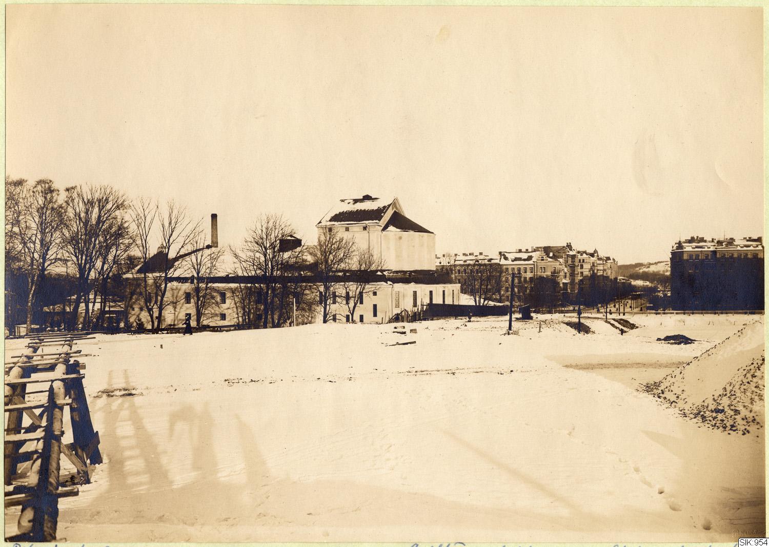 Fotografi av Lorensbergsteatern sedd från blivande Götaplatsens mitt. Foto taget 15/11 1917.