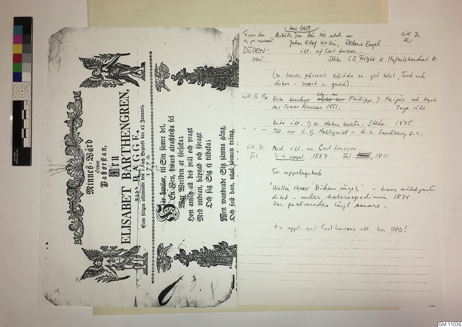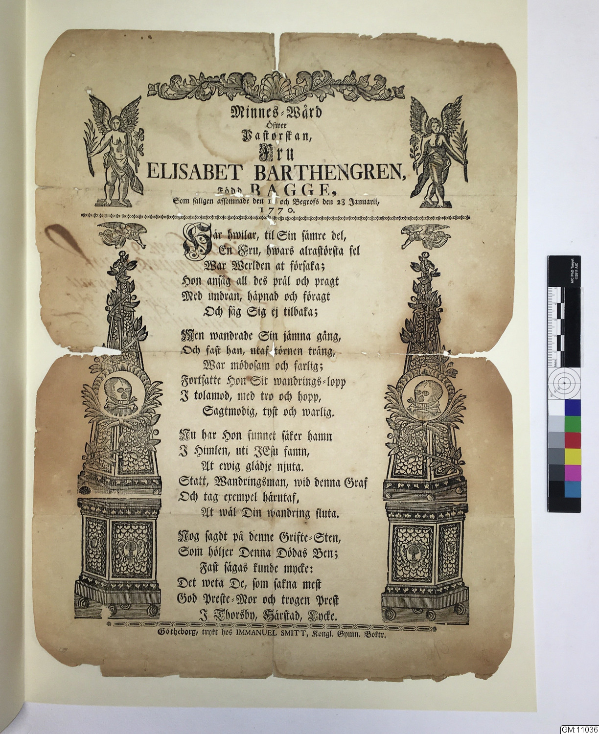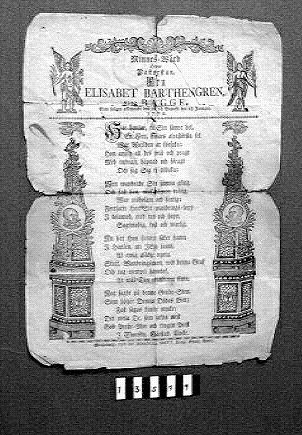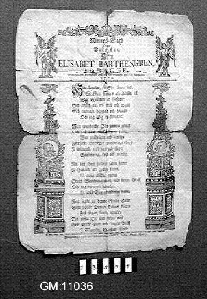 - Gravskrift från 1770, över fru Elisabeth Bartengren, född Bagge. Prytt med fyra (4) änglar, två stående med växter i händerna, 2 st flygande över kolonner. Koniska överdelar med döskallar i medaljonger. Växt slingrar sig uppför kolonnerna. Överst växtornamentik, längst ner kedjebård.