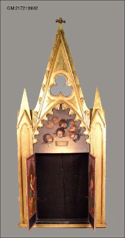 Matt och glansförgylld minnestavla med ramerk i form av kyrkosiluett. Dekorerad med bevingade keruber utförda i olja av konstnären Gustav Henrik Brusewitz. Under de målade keruberna på tavlans övre del är ett böjt metallbleck fastsatt med okänt användningsområde. Tavlans nedre del har två öppningsbara dörrar på insidan dekorerade med änglar. Innanför dessa har ett porträtt av fru Carolina Christina Nyström på sin dödsbädd varit placerat.
