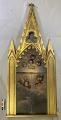 Matt och glansförgylld minnestavla med ramerk i form av kyrkosiluett. Dekorerad med bevingade keruber utförda i olja av konstnären Gustav Henrik Brusewitz. Under de målade keruberna på tavlans övre del är ett böjt metallbleck fastsatt med okänt användningsområde. Tavlans nedre del har två öppningsbara dörrar på insidan dekorerade med änglar. Innanför dessa har ett porträtt av fru Carolina Christina Nyström på sin dödsbädd varit placerat.