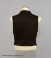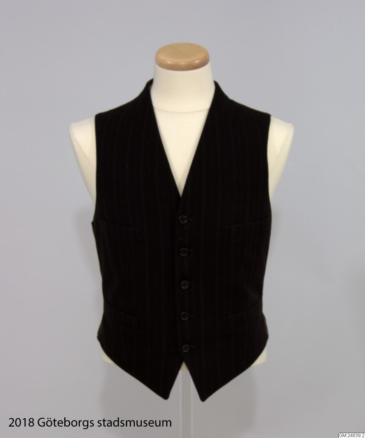 Väst, av mörkbrunt kypertvävt ylle med smala vita ränder. Fodrad med randigt bomullstyg i vitt och blått. Knäppt med 5 st släta bruna knappar. Fyra västfickor.