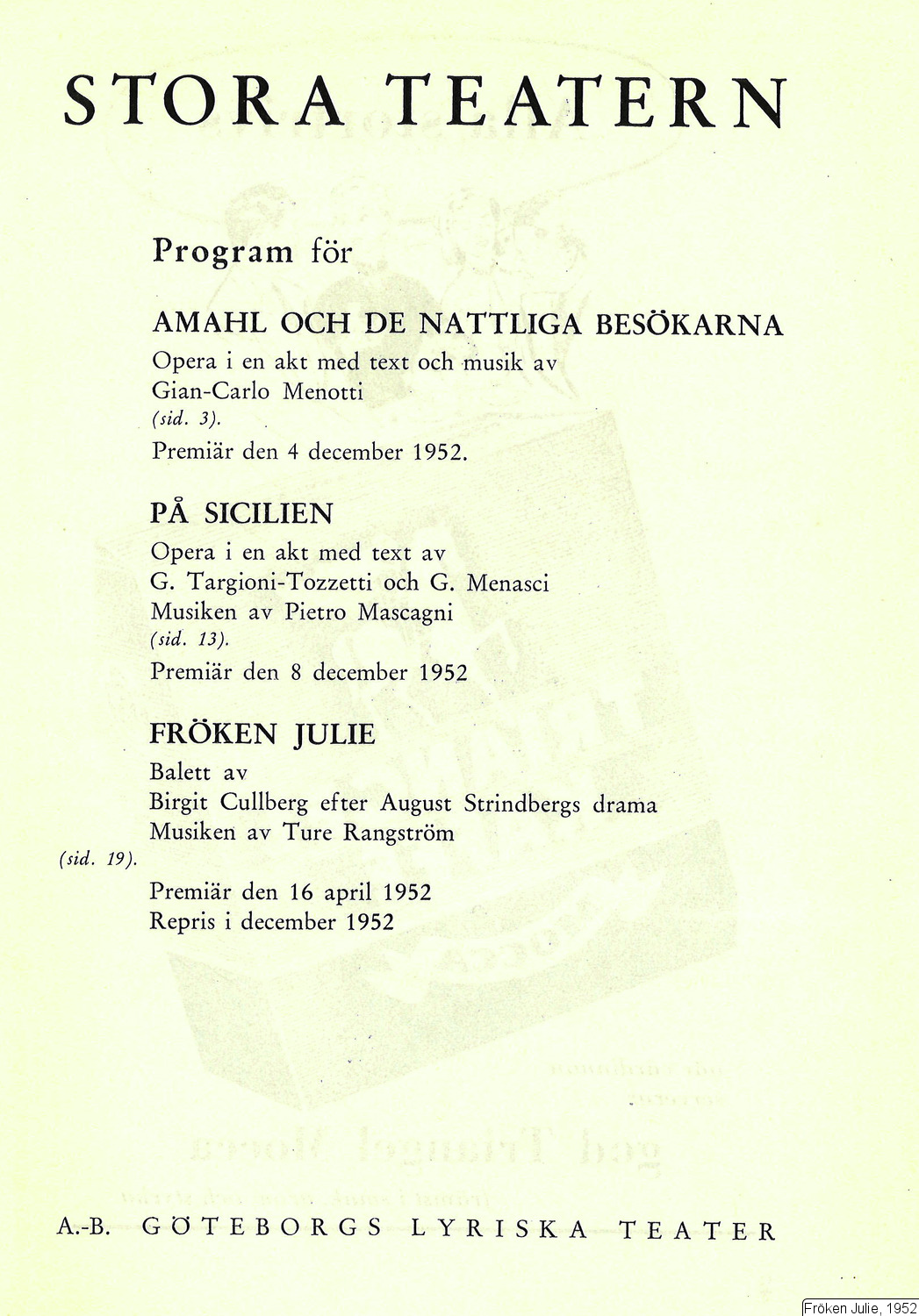 - Uppsatt tillsammans med baletten Fröken Julie och operan Amahl och de nattliga besökarna. Spelad 6 ggr. Repriserad i april 1953.