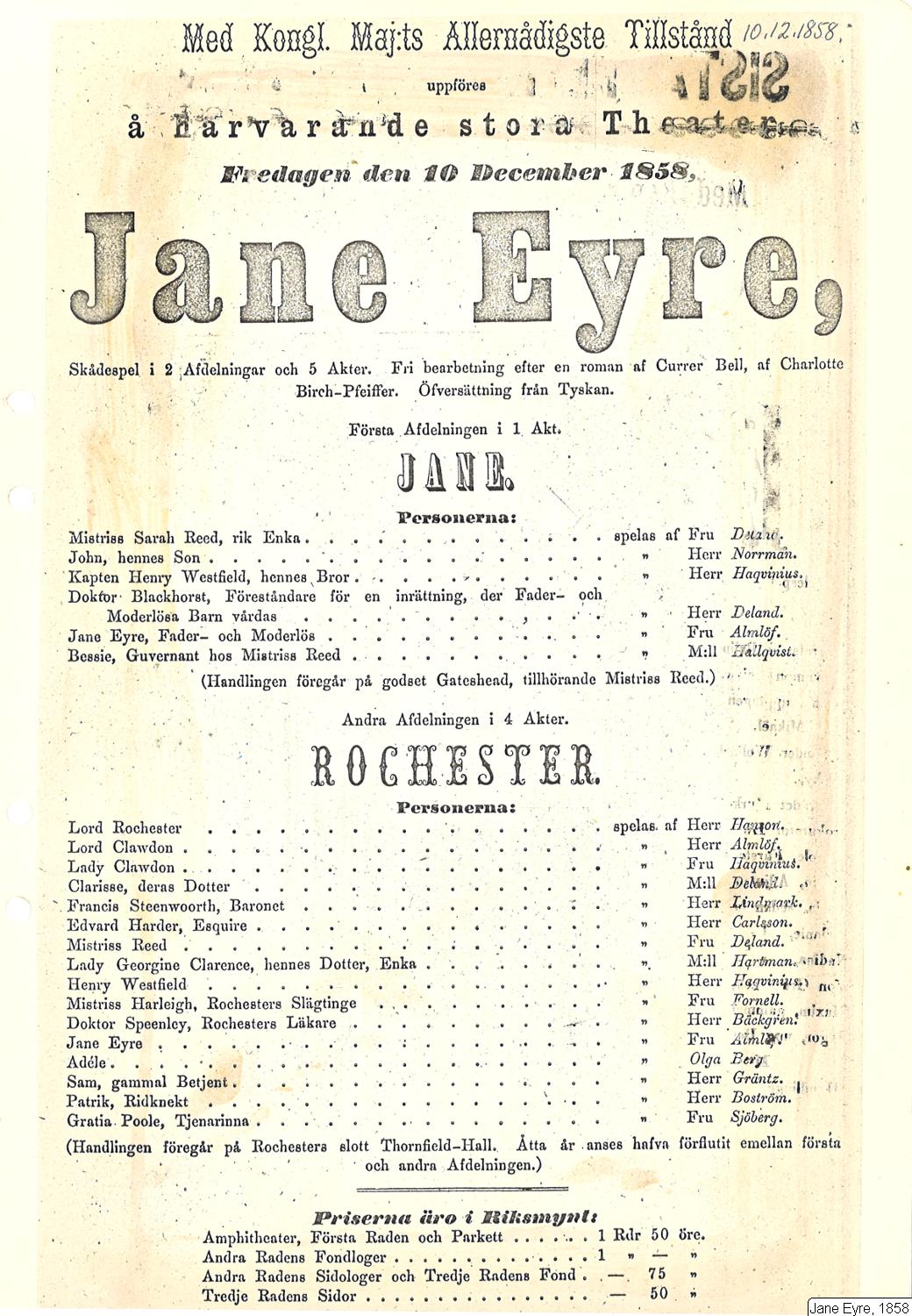 Pjäs i 2 avdelningar och 5 akter av Charlotte Birch-Pfeiffer efter romanen av Charlotte Brontë.