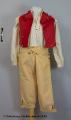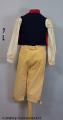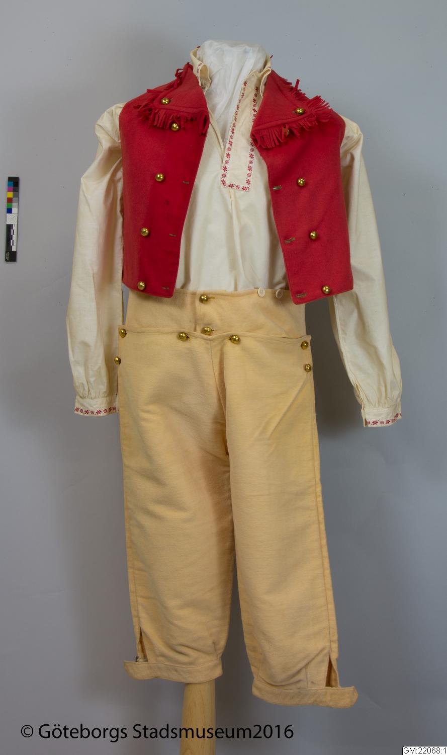 Tredelad dräk,t skjorta av vitt bomullstyg med röda broderier på manschetter krage och halssprund, knäbyxa i sämskskinsgult mollskinn( säskild tygkvalite som ska likna sämsskinn)knäpps med mässingsknappar och har spännen vid knäna, väst med mörkblå rygg och röda framstycken, fransar på kragen samt mössingsknappar. Bygdedräkt uppsydd till någon av Blanche Bondes söner. Det går inte att avgöra vilket landskaps folkdräkt som varit förebild.Fantasikostym
