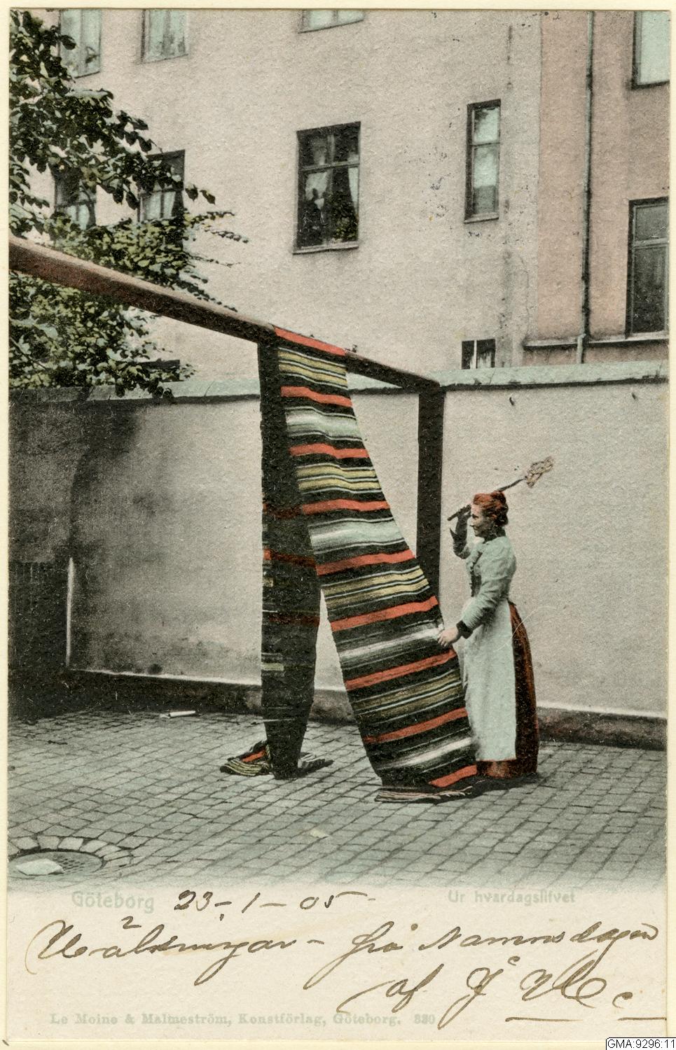 Postcard stamped 1905, showing a woman beating a carpet.