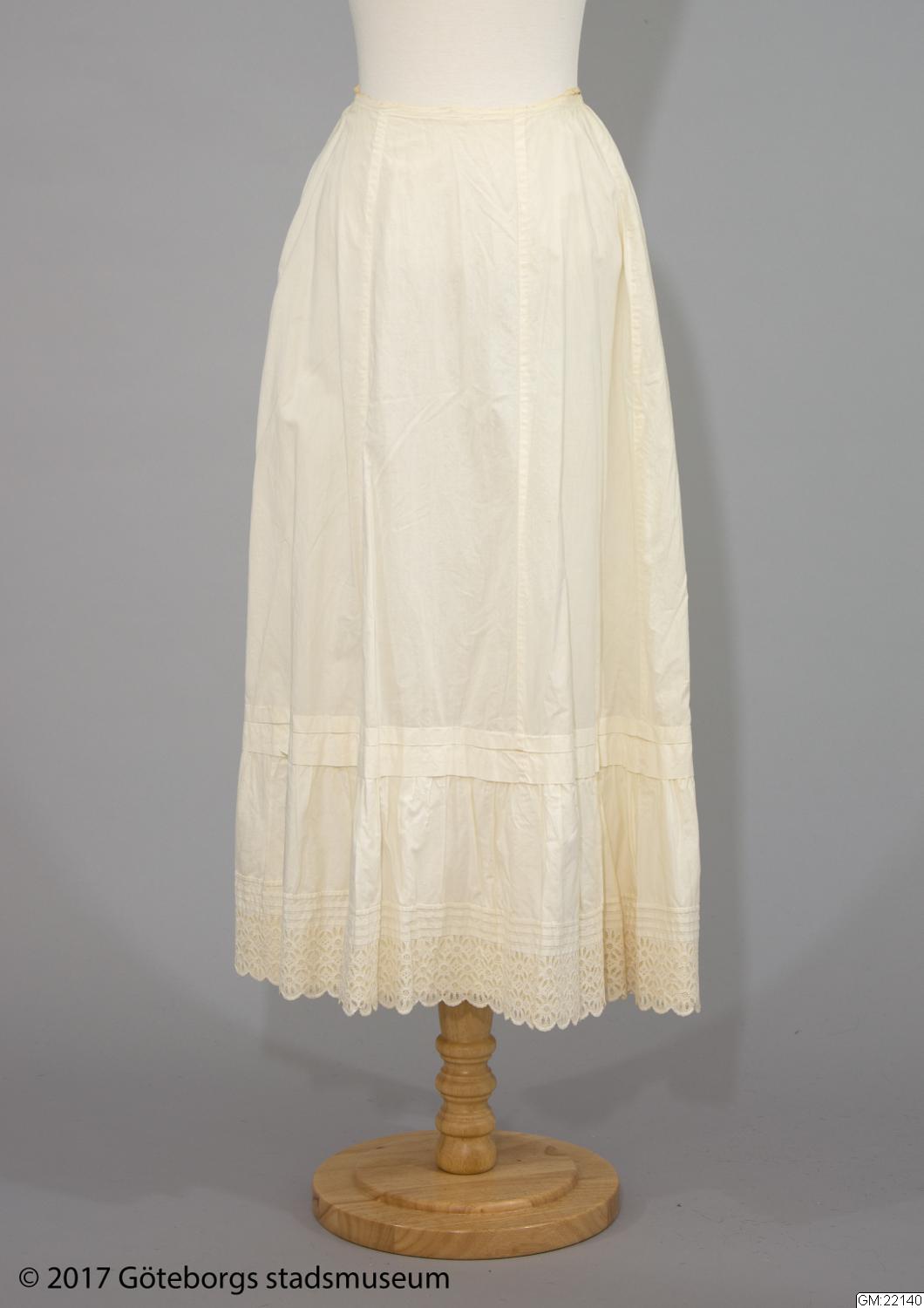 Underkjol av tunn vit bomull. Fotsid, sydd i sex våder. Nedtill rynkad kant i brodyr. Längd: 88 cm, vidd: 244 cm.