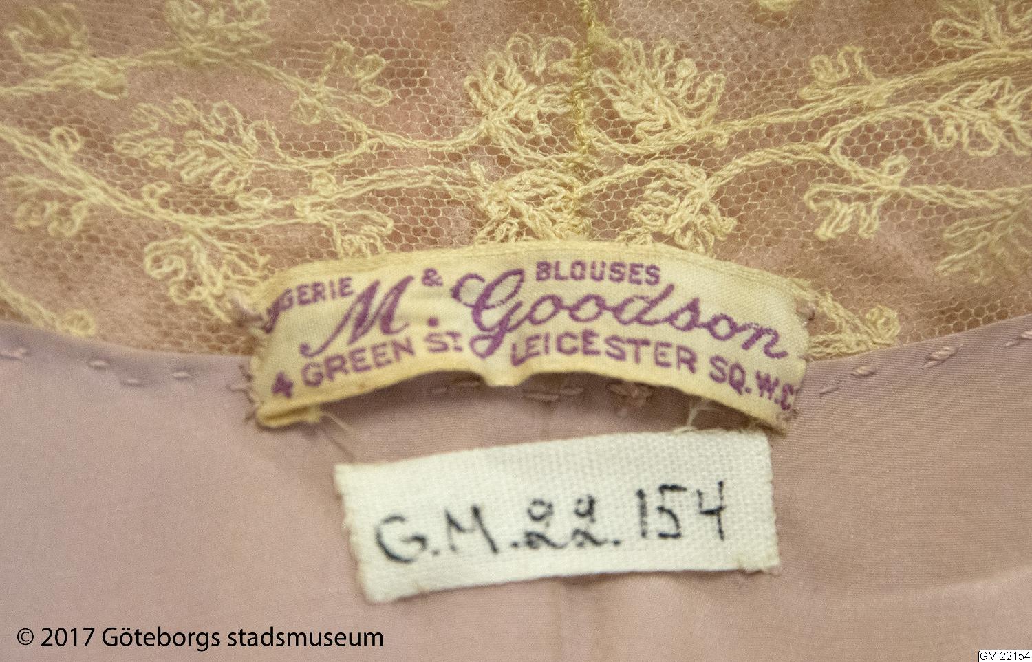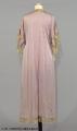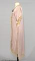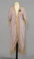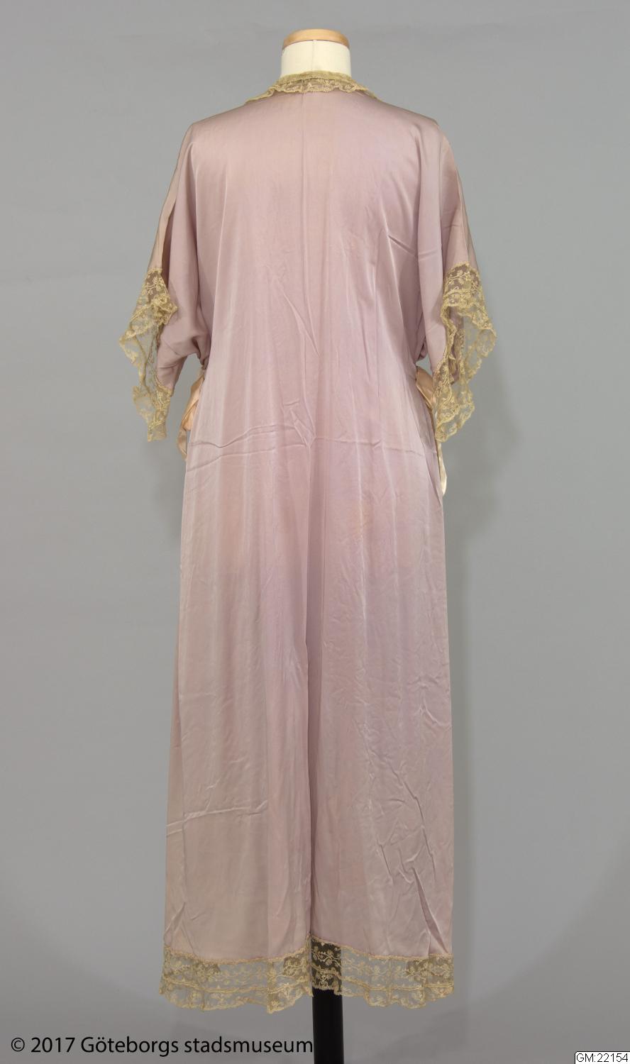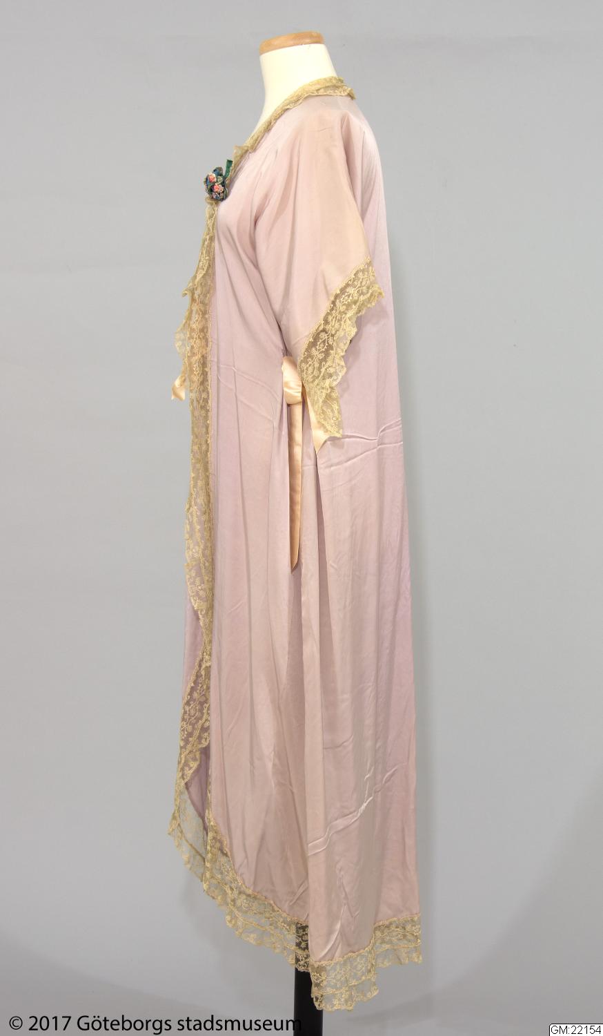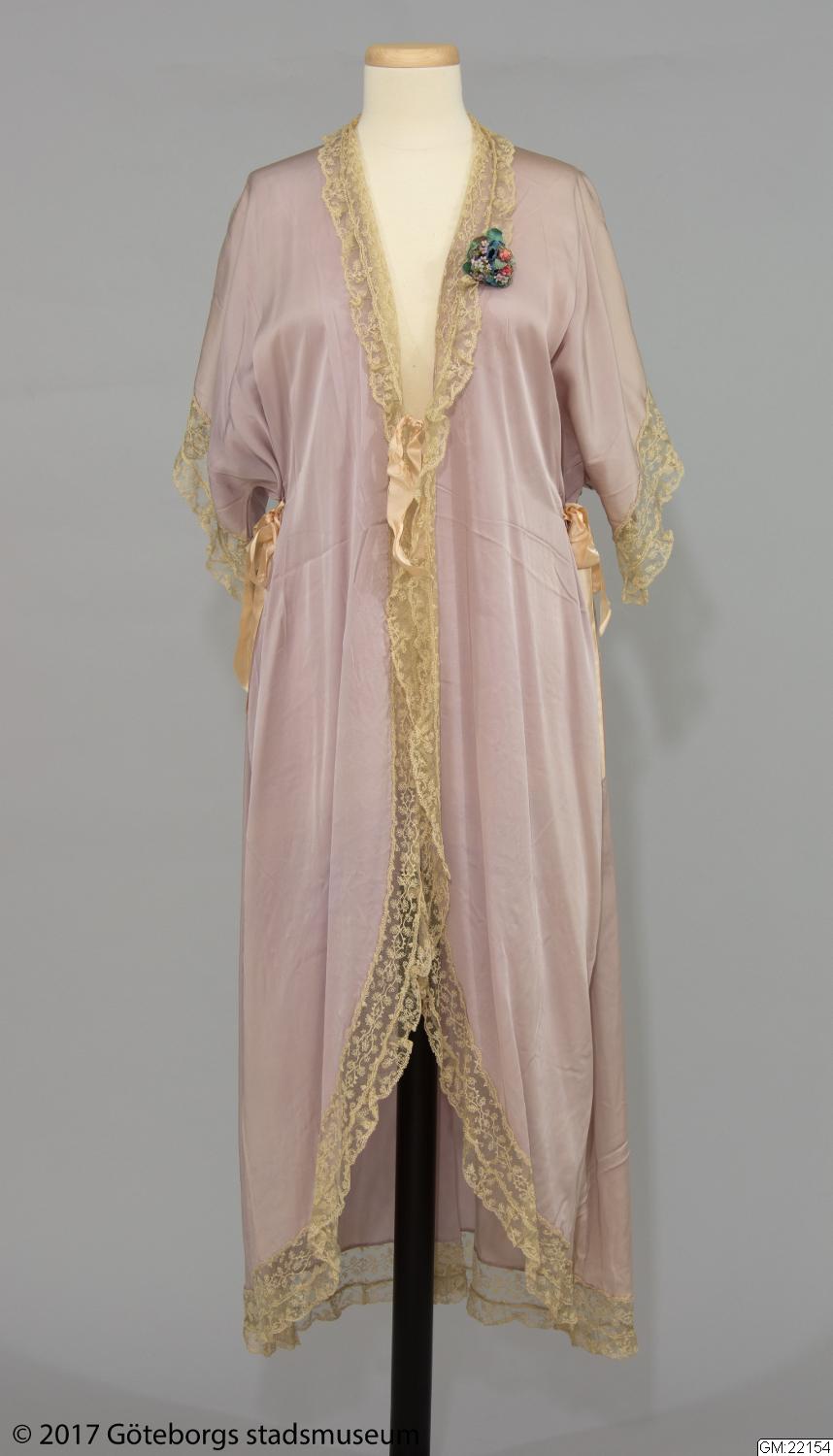 Morgonrock av violett sidengeorgette. Rak med framtill svängda våder. Halvlång kimonoärm. Denna och övriga kanter försedda med crèmefärgad tyllspets. Rosa rosetter i helsiden. Längd: 123 cm.