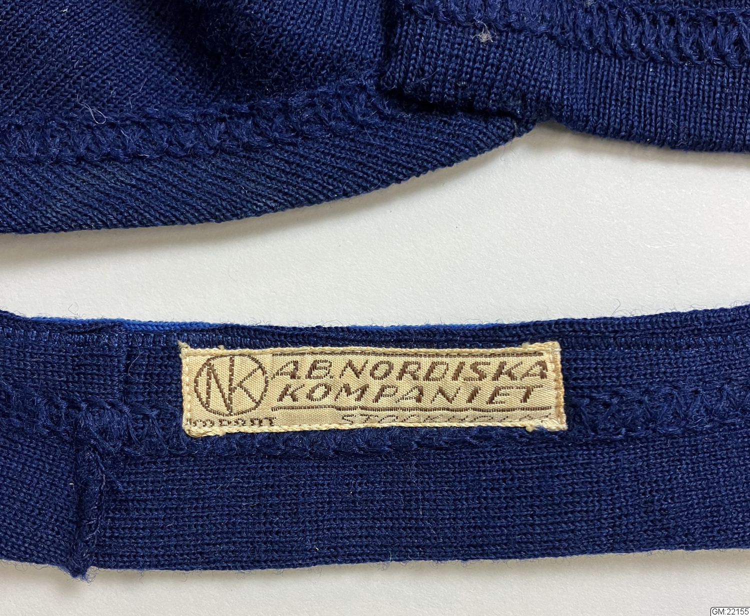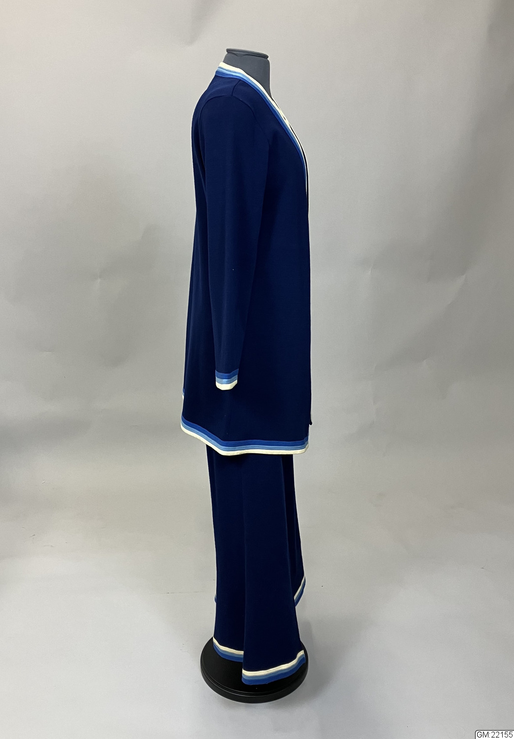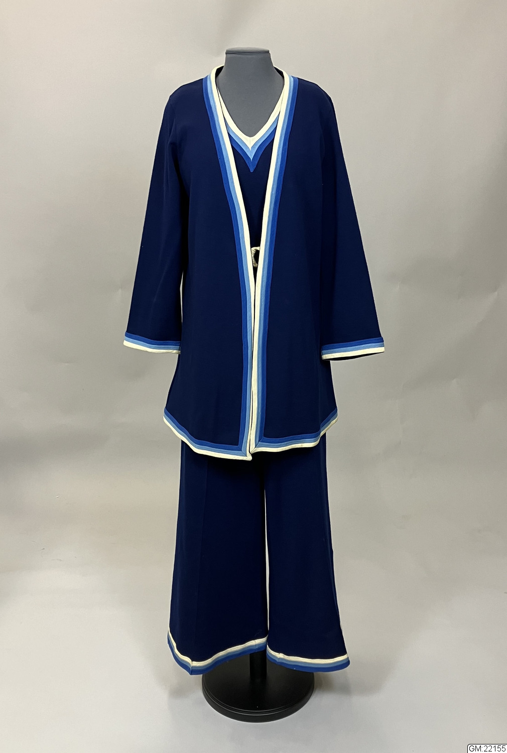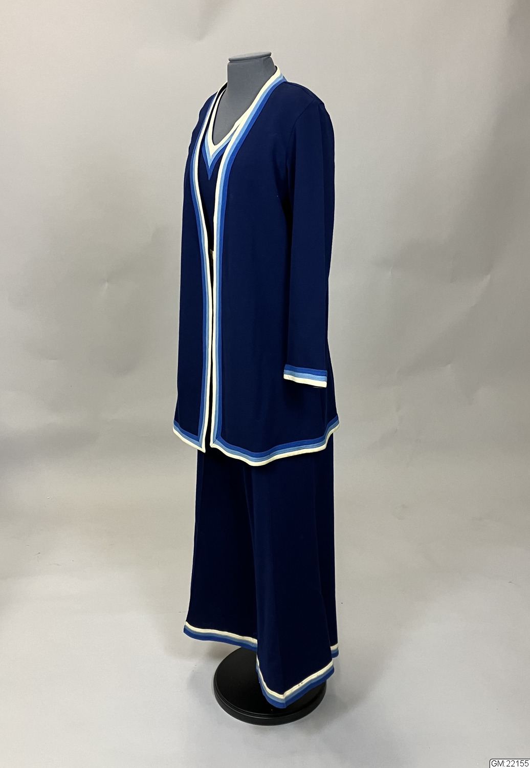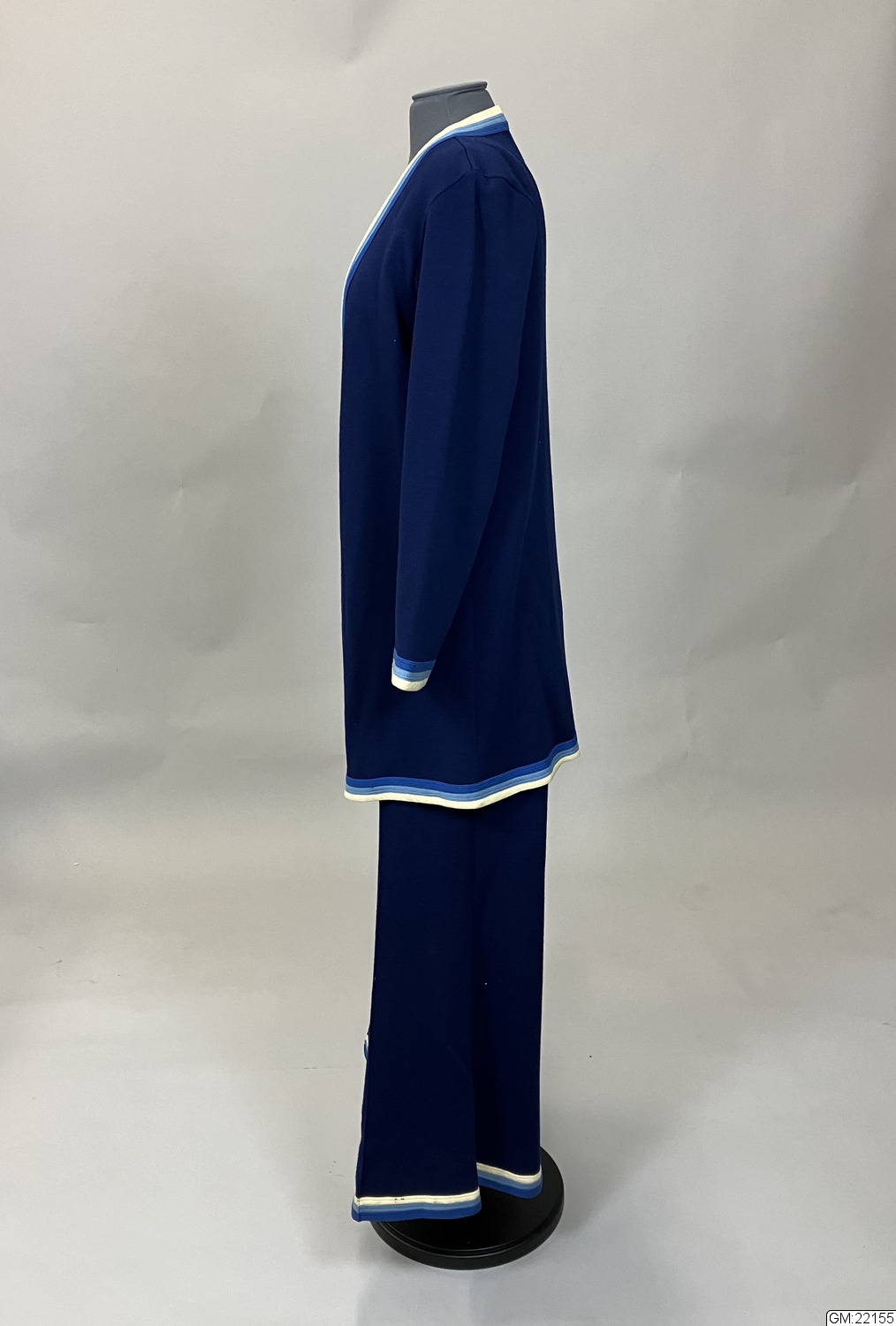 Jacka och byxor av mörkblå ylletrikå kantad med ylleband i två nyanser av blått samt vitt. Vitt skärp med två benringar som knäppanordning.