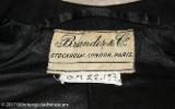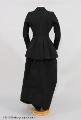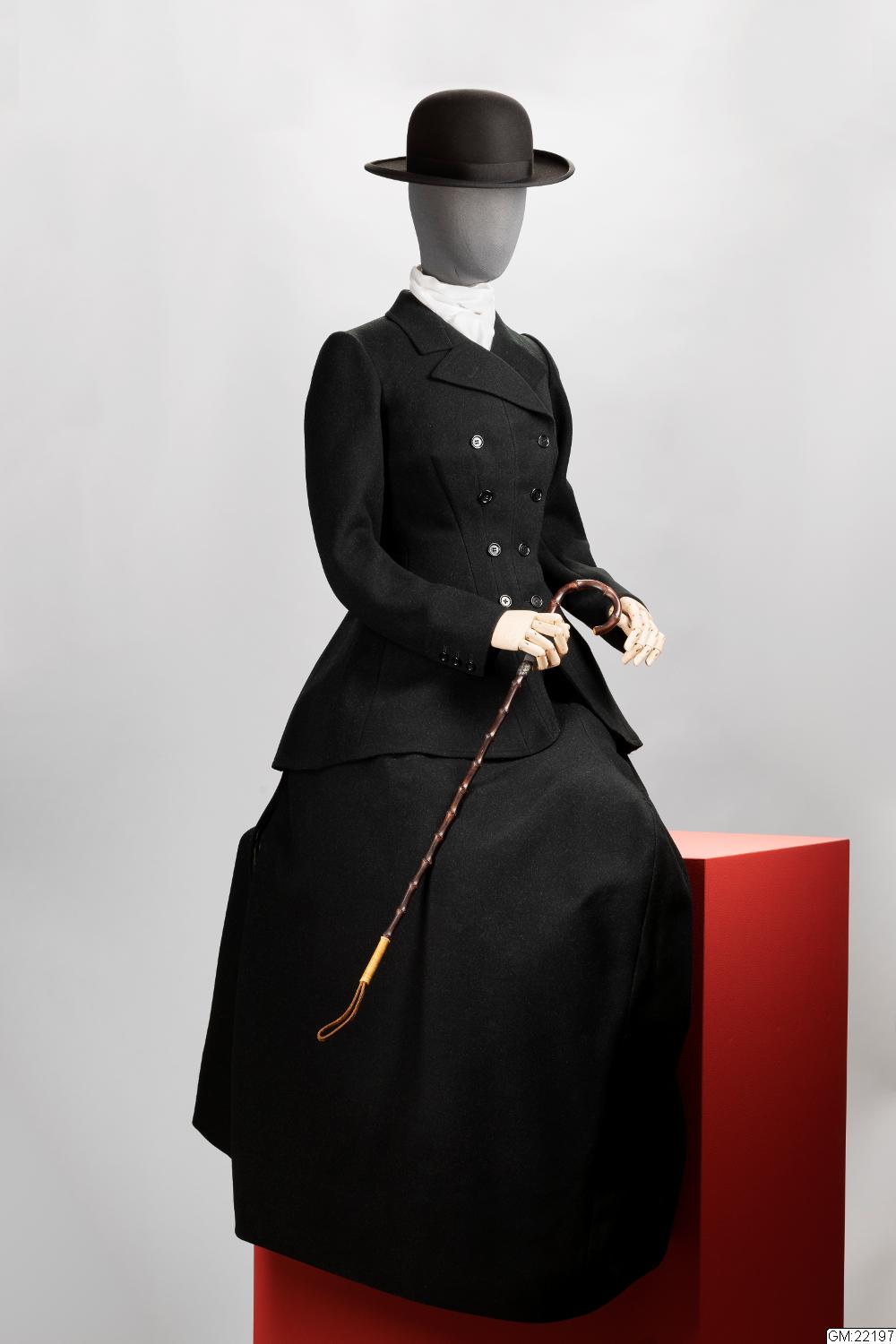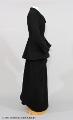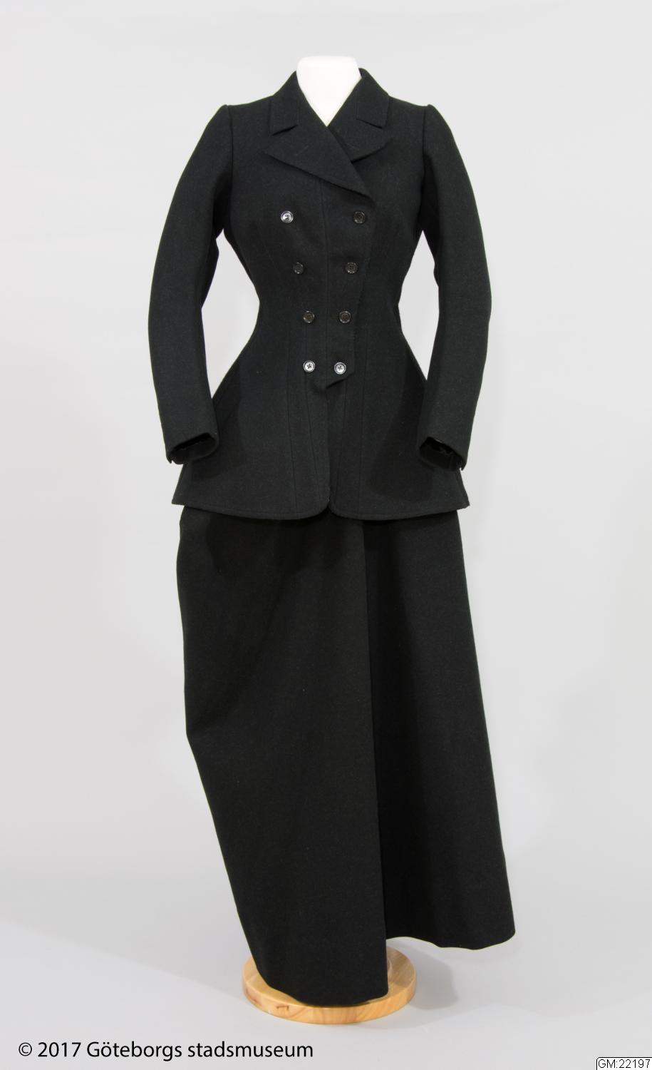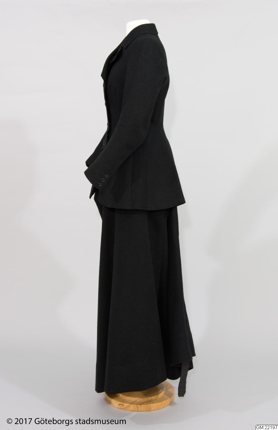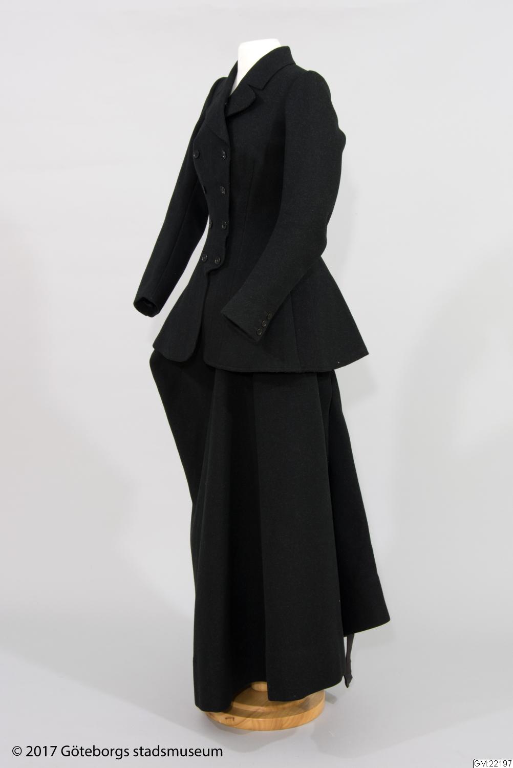 Riddräkt för dam av jacka och kjol av svart kläde. Framtill dubbelknäppt. Svängda skört. Stickad krage och nederdelen på ärmar med knäppning. Kjol, fotsid, öppen baktill hopfästes med häktor. Framtill avsydd för knän (damsadel). Se foto av grevinnan Bonde till häst å särskilt kort. Längd: 74 cm, ärmlängd: 64 cm.