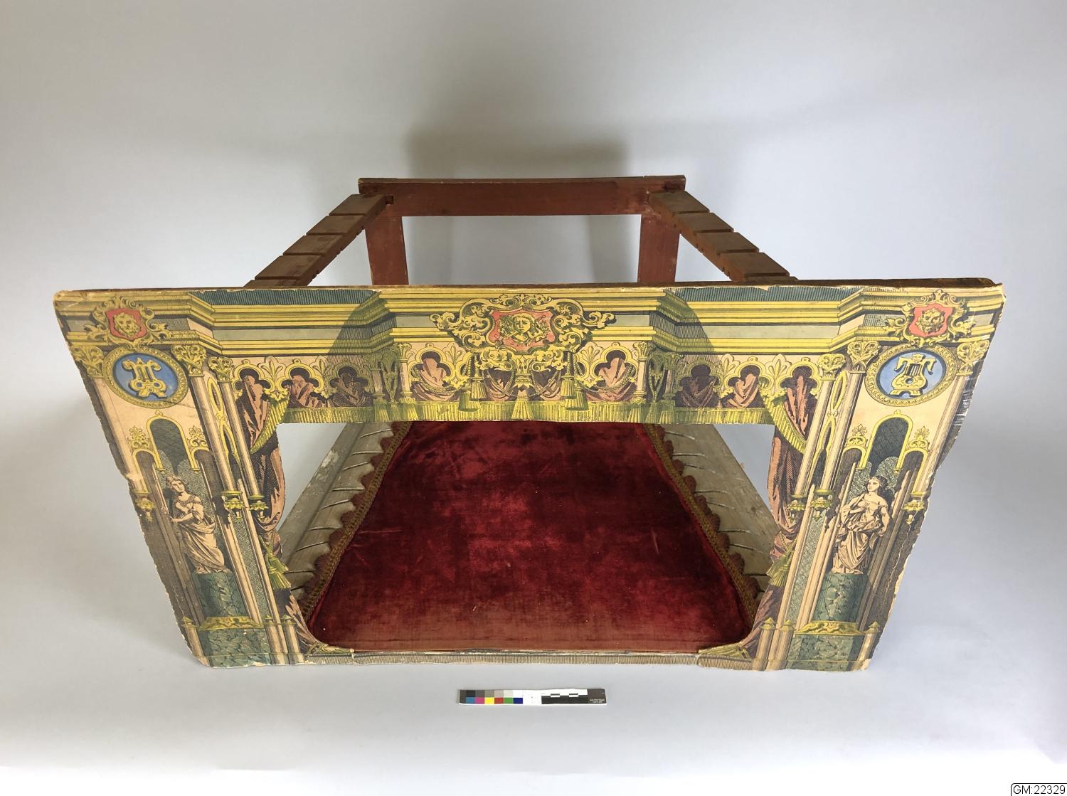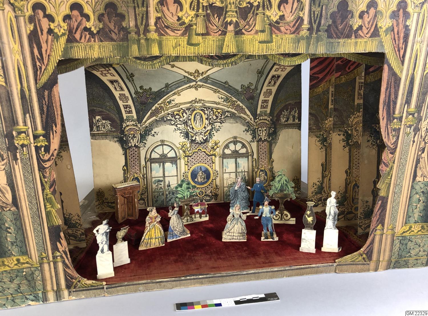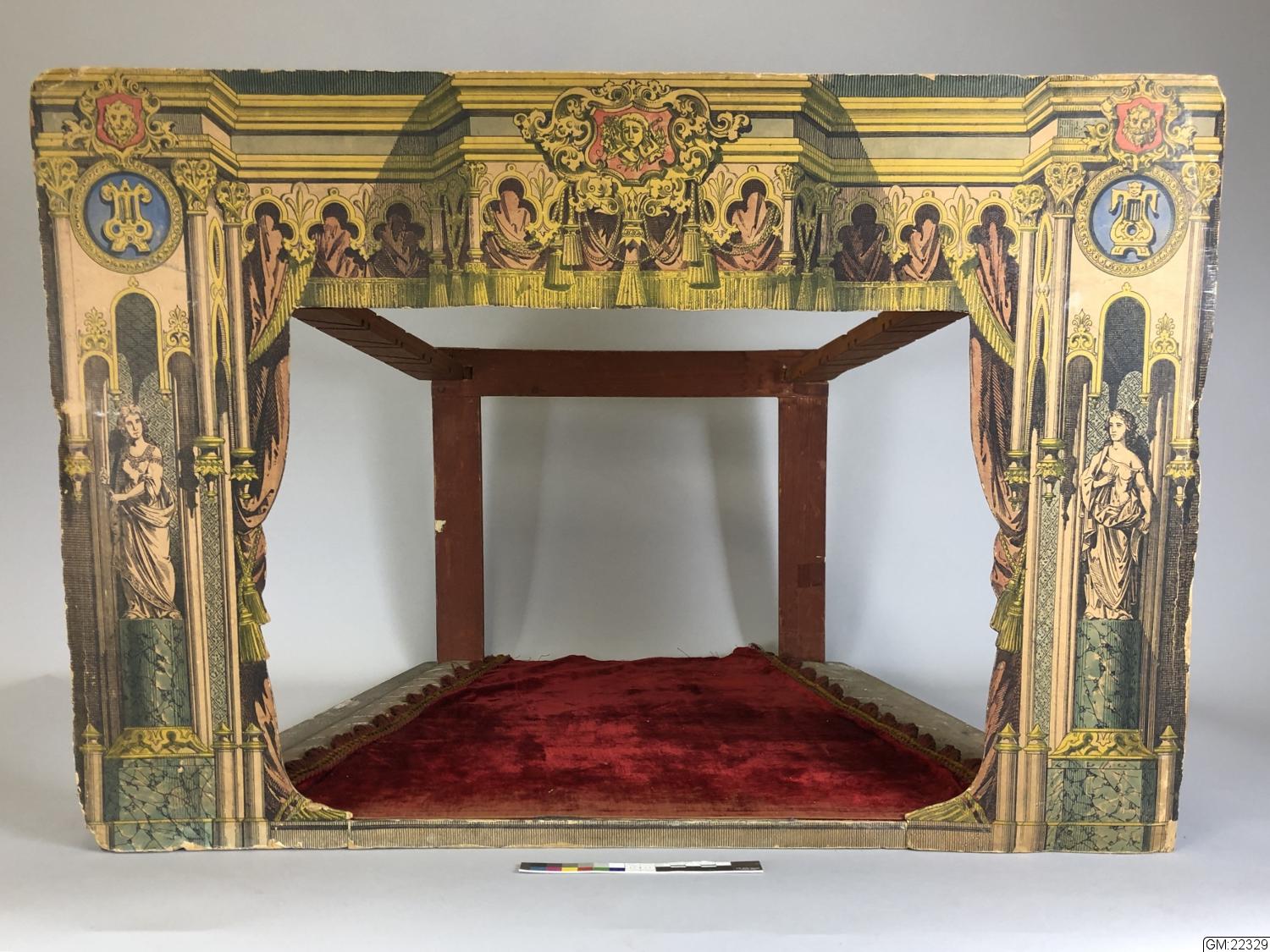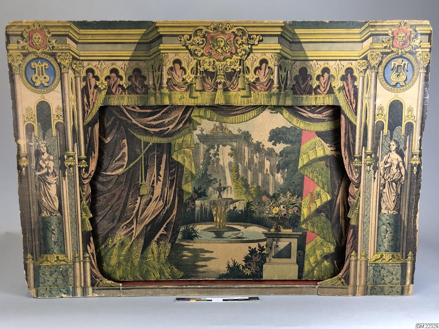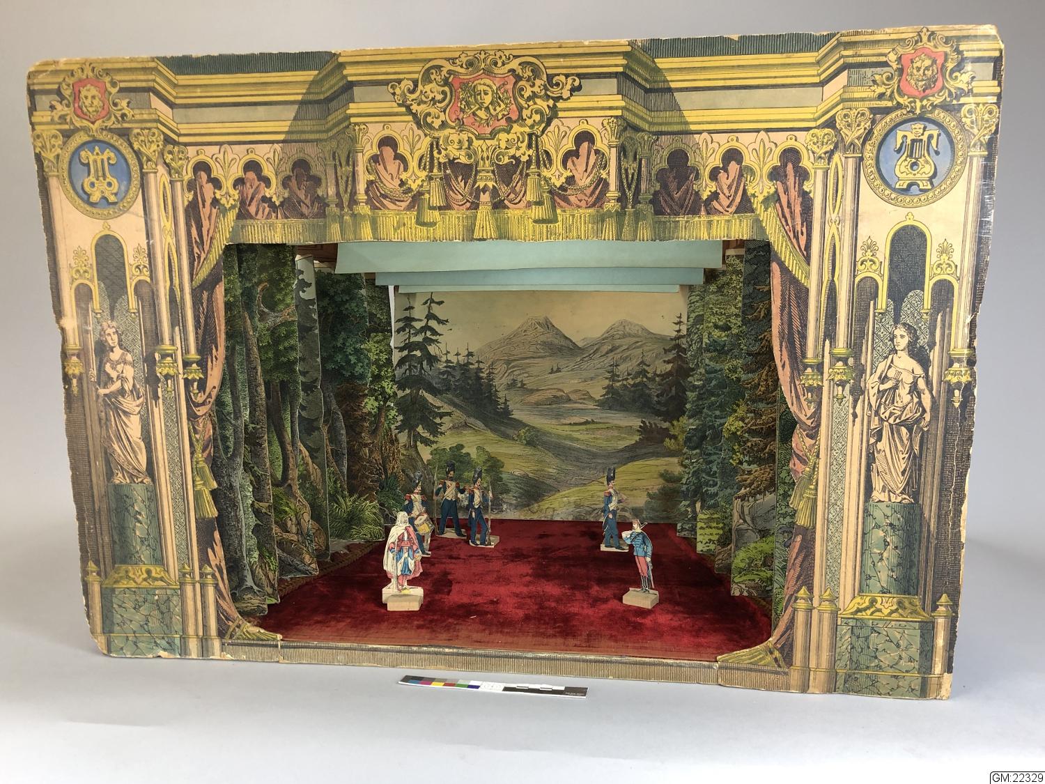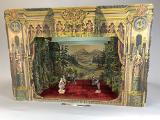 Scen är tryckt, målat papper, monterat på papp och träställning. Härtill 2 fonder, lösa sidokulisser, himmelskuliss och en sida, vidare skådespelare av papper jämte metall stickor för deras hanterande. Även 2 blad med text ur skådespel på engelska. Förmodligen 1850-talet.