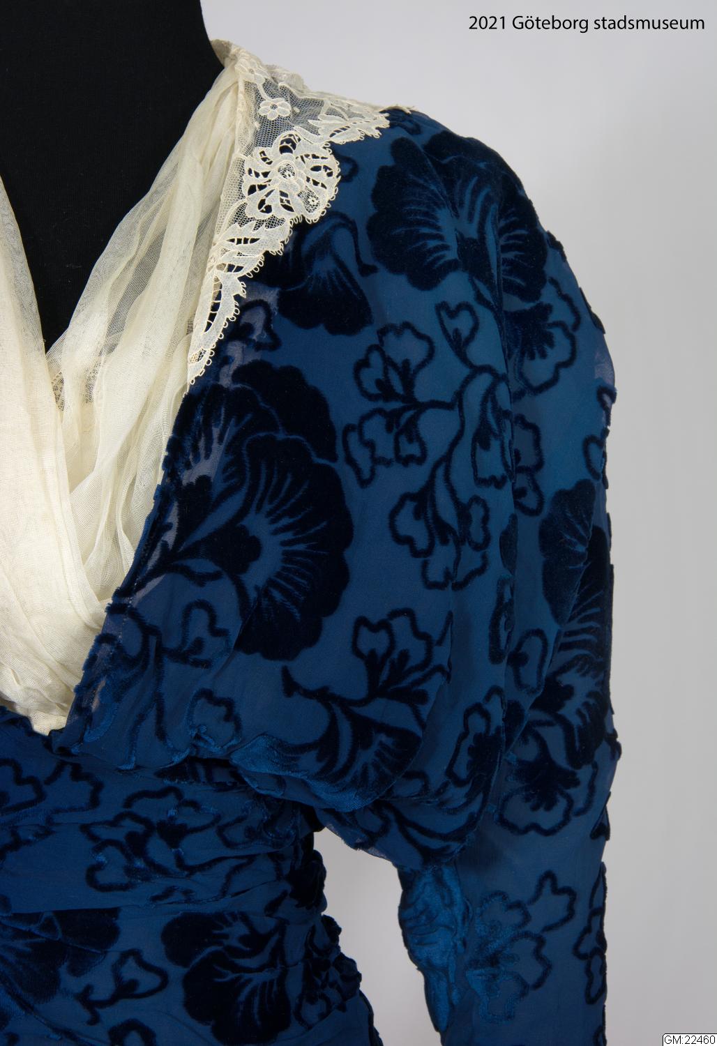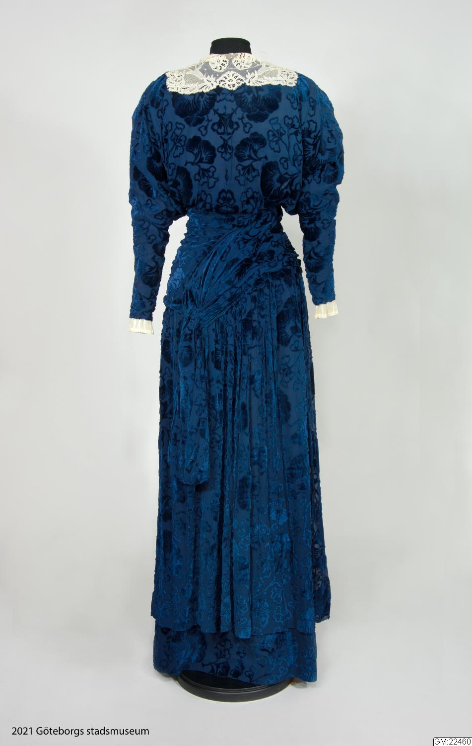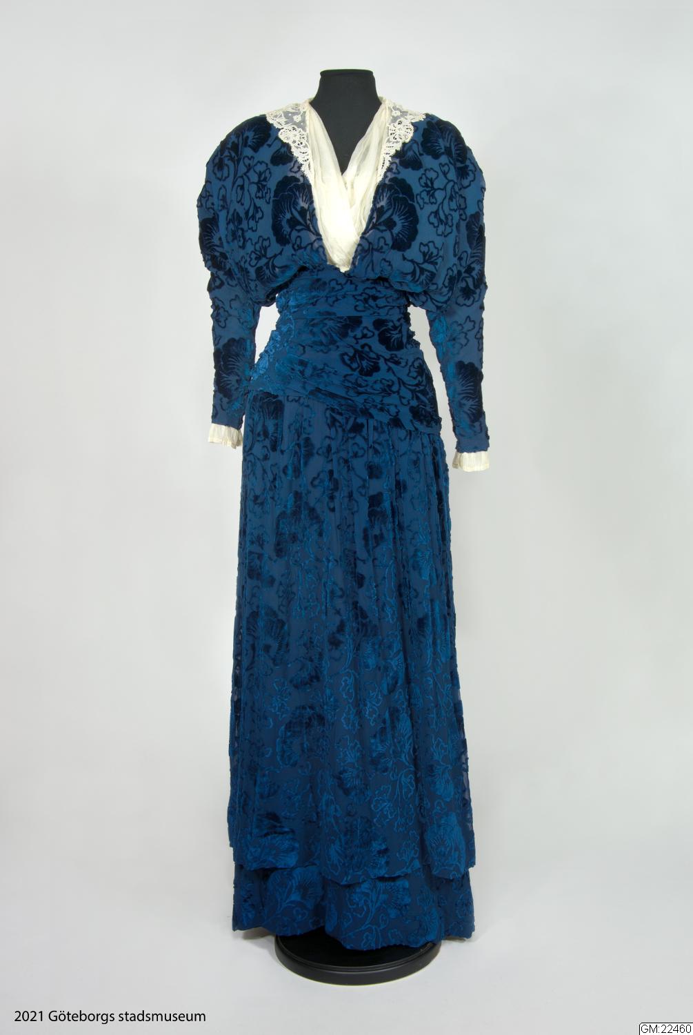 Klänning av mörkblå chiffon med mönster i sammetdvävnad (velour broché). Lång överklänning. Underdelen är sydd vid en kjol av svart toilettesiden. Livet är skuret i kimonoform, har isättning av silkestyll och spetskrage. Ärmar är vid handleden helt åtsittande och knäppes med fyra tränsade knappar och öglor. Ett plisserat rysch i silkestyll avslutar. Bred gördel draperad runt midja och höft. Ett vitt foderliv, spetskantat och försett med fem st. insydda fjädrarvarav två tjänar som planchett vid knäppningen. Samt ett svart foderliv med lång ärm. Livband med firmamärke: Henr. Ahlberg Mode-Magasin Göteborg. Längd 149 cm, vidd underklänning: 156 cm, vidd överklänning 184 cm.