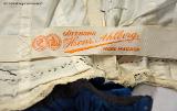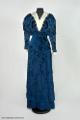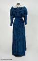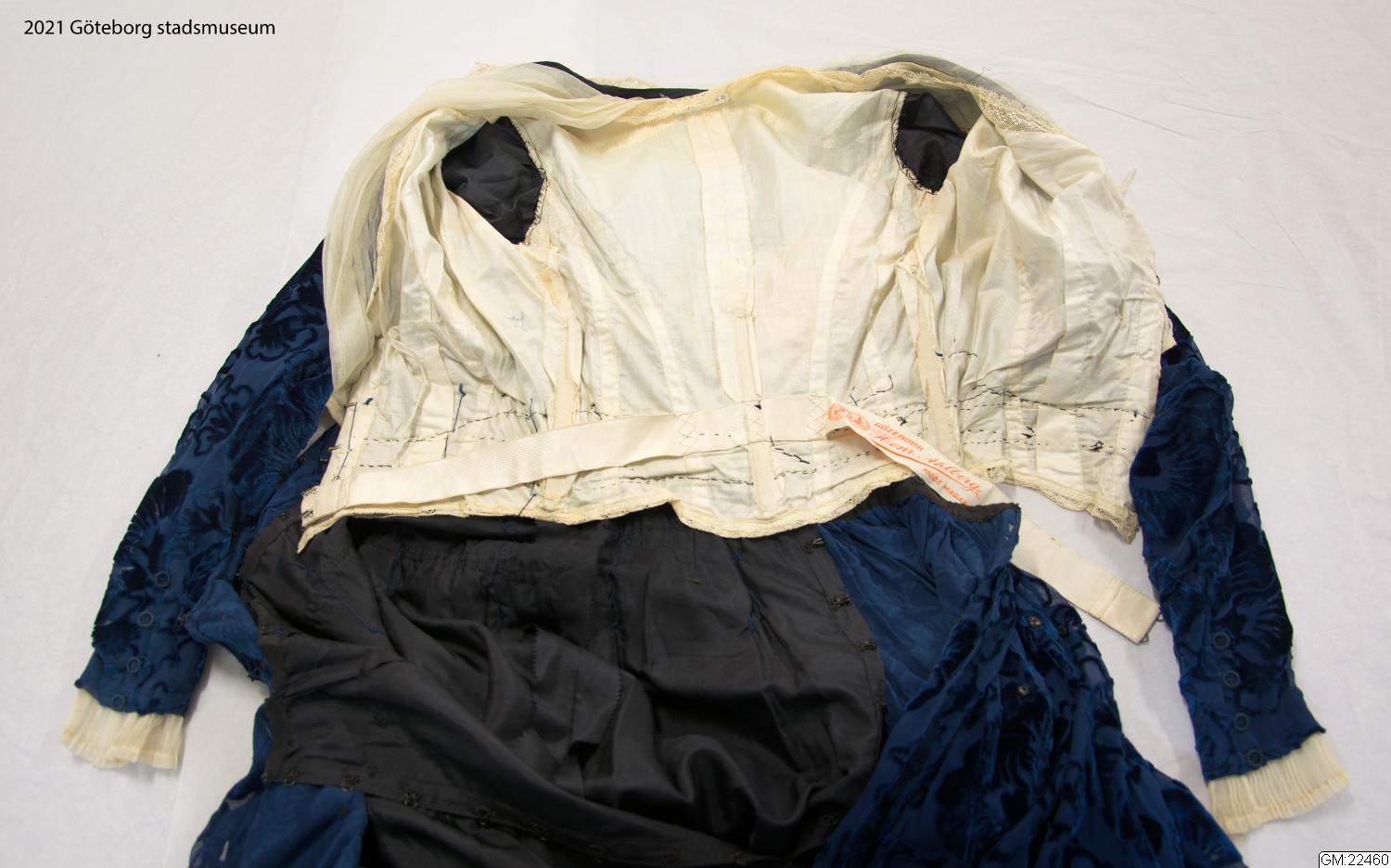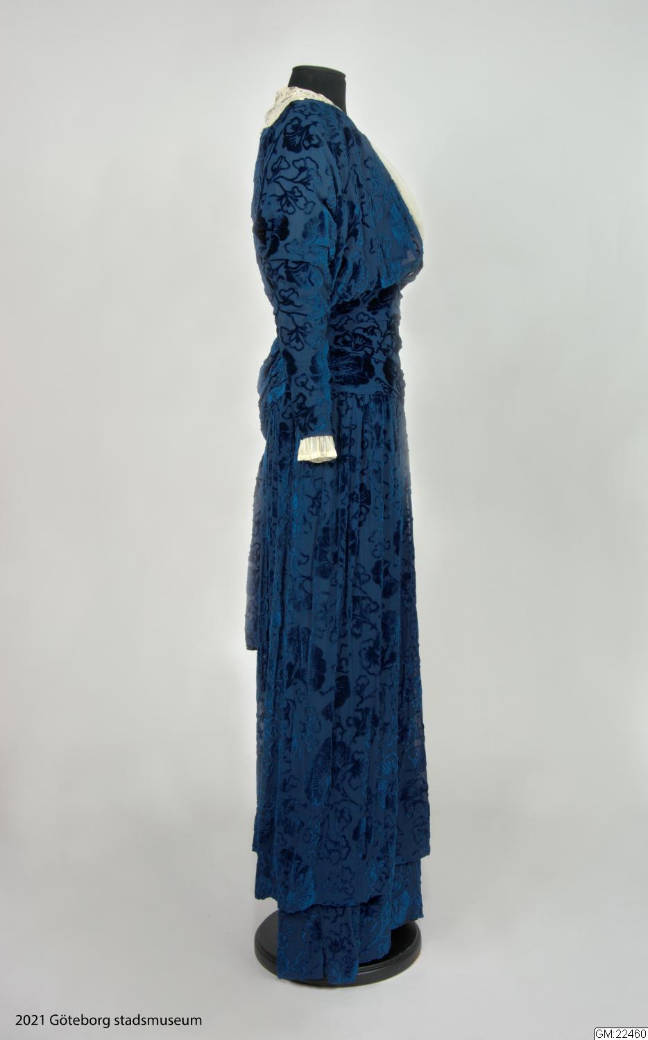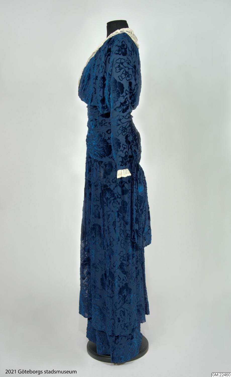 Klänning av mörkblå chiffon med mönster i sammetdvävnad (velour broché). Lång överklänning. Underdelen är sydd vid en kjol av svart toilettesiden. Livet är skuret i kimonoform, har isättning av silkestyll och spetskrage. Ärmar är vid handleden helt åtsittande och knäppes med fyra tränsade knappar och öglor. Ett plisserat rysch i silkestyll avslutar. Bred gördel draperad runt midja och höft. Ett vitt foderliv, spetskantat och försett med fem st. insydda fjädrarvarav två tjänar som planchett vid knäppningen. Samt ett svart foderliv med lång ärm. Livband med firmamärke: Henr. Ahlberg Mode-Magasin Göteborg. Längd 149 cm, vidd underklänning: 156 cm, vidd överklänning 184 cm.