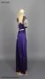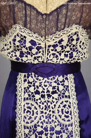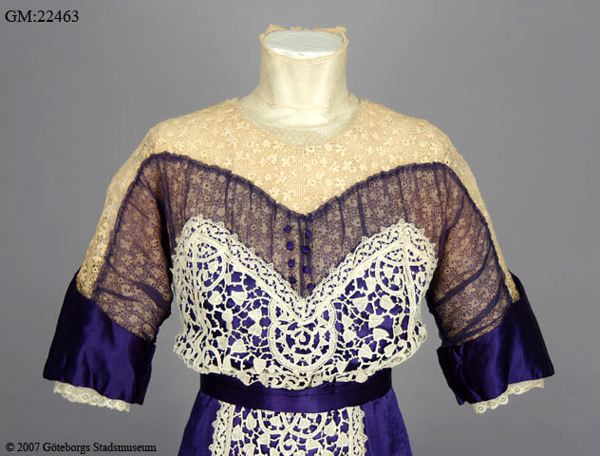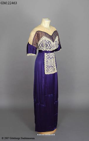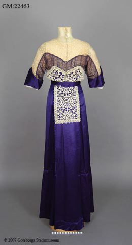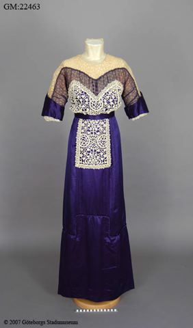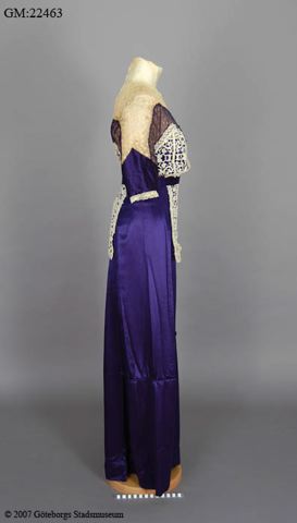 - Från katalogkort: Klänning. Foderliv av bomullstyg med voileärmar. Liv i kimonoform med isättning och ståndkrage av tyll. För övrigt av cremefärgad spets, delvis överklädd med blå georgette, samt däröver, ej helt täckande, grov spets som fortsätter ner på kjolen både fram och bak, i ett rektangulärt stycke 29 x 19 cm. Ärmuppslag av violett siden. Kjolen av violett mjukt siden är rak med till knähöjd nedsydda, smala veck. Nederdelen av kjolen är slät med ett löst lagt veck bak och är sydd till överdelen medels en passpoal. Skärp av tyget lagt i veck och med överklätt spänne. Knäppning bak med hakar och hyskor. Underkjol av blå japon. Midjebandet i livet märkt: Augusta Lundin Stockholm 20 Brunkeborgstorg. Längd: 148 cm, vidd: 165 cm.