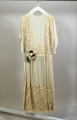 Klänning av vit georgette med kort, vid ärm, lågt isydd och tvärgående halsringning. Långt liv, något överfallande. Kjolen har två, löst hängande överstycken. Dessa, likso, liv och gördel ha breda bårdspartier, broderade med venetiansk söm.