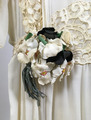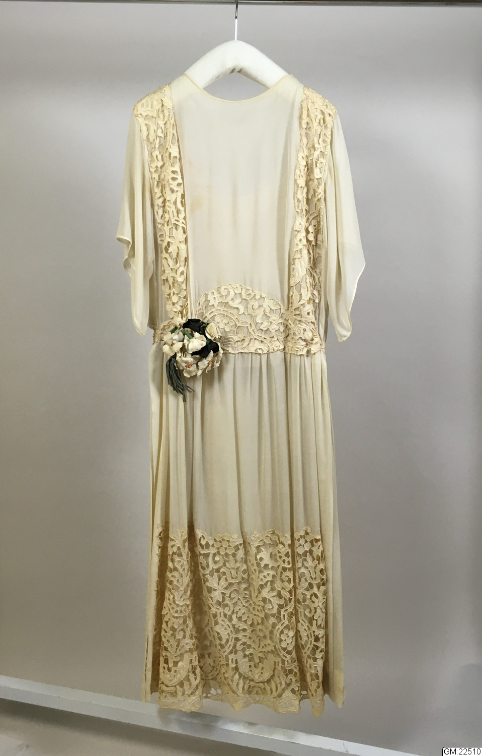 - Klänning i tunnt vitt siden med bårder av hålspets med en stor blombukett på högra höften.