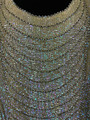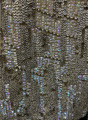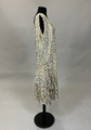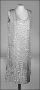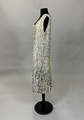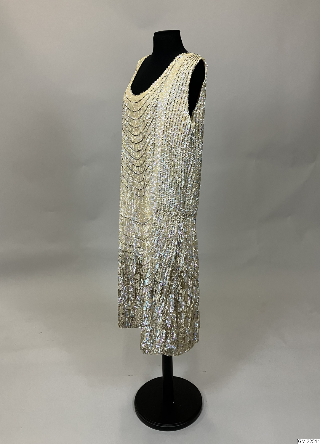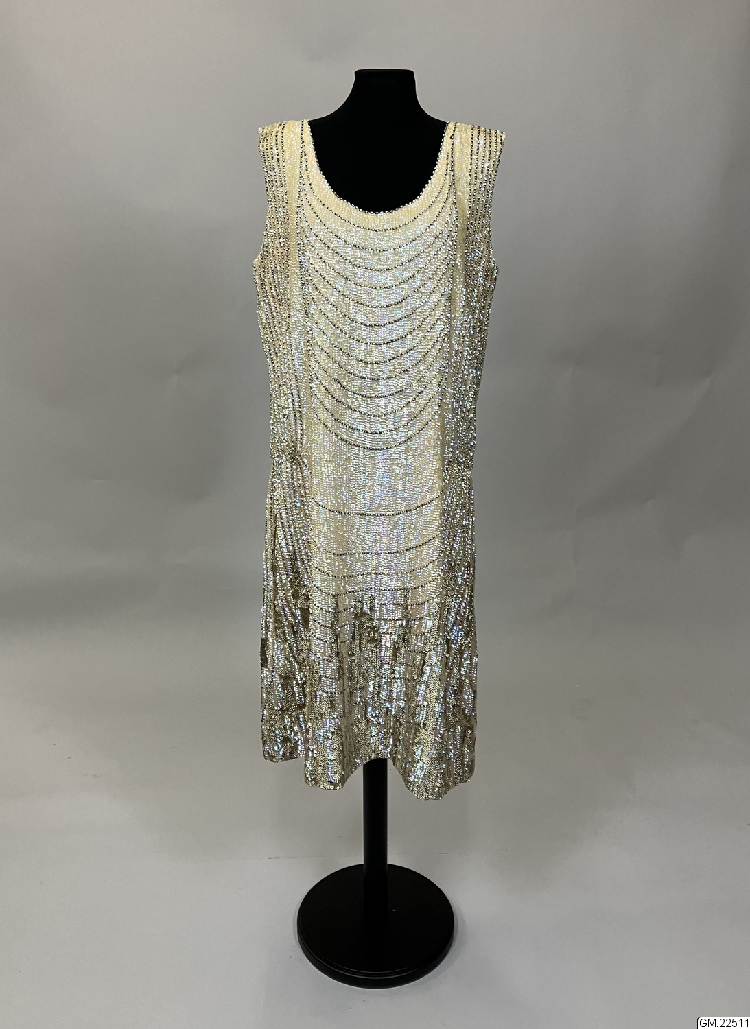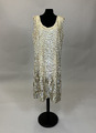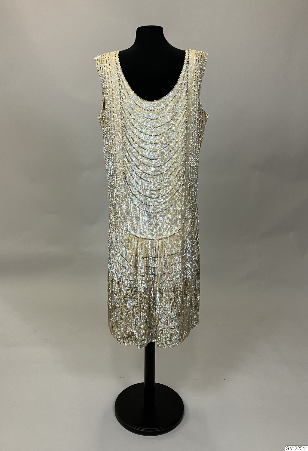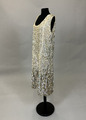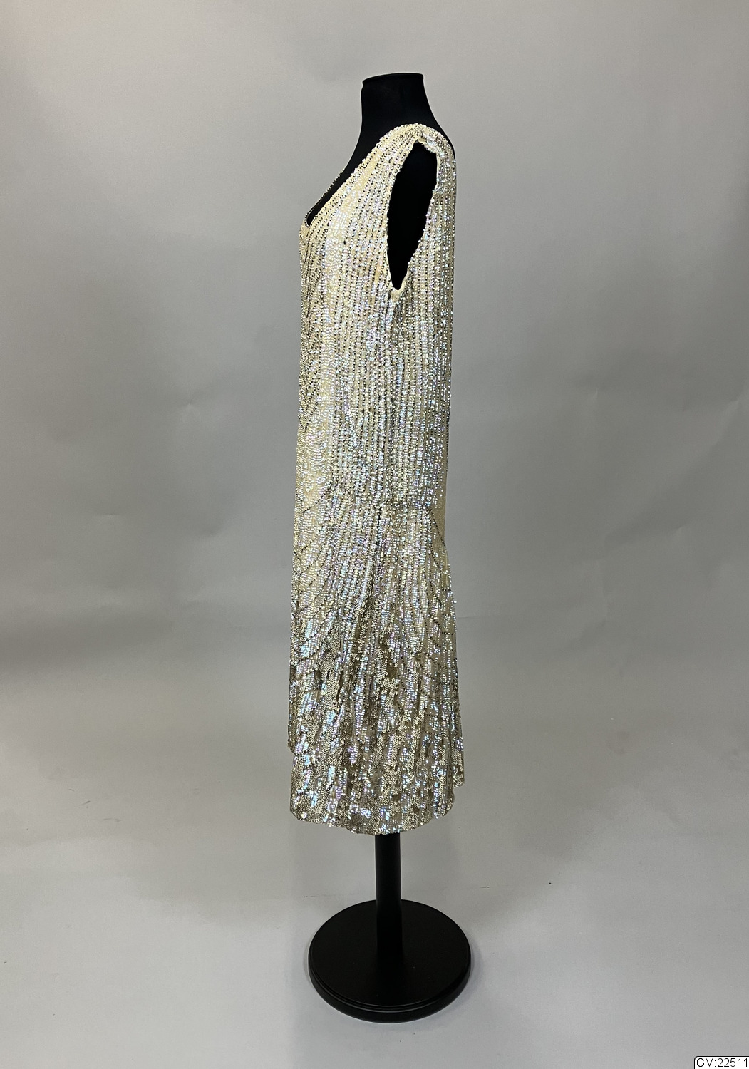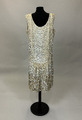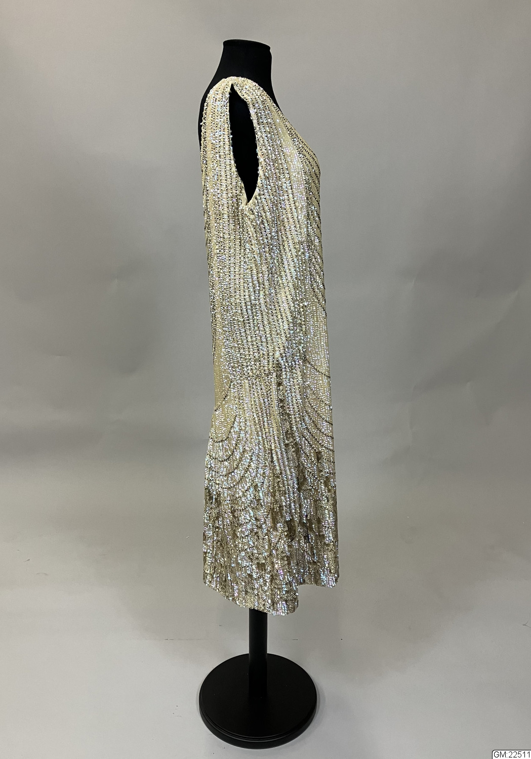 Klänning, Längd m. uppläggning: 121 cm, vidd: 148 cm. Rak, ärmlös modell. Helt täckt av pärlemorskimrande paljetter samt pärlor, guldfärgade, vilka sytts på klänningen i bågmönster. Rund, djup ringning.