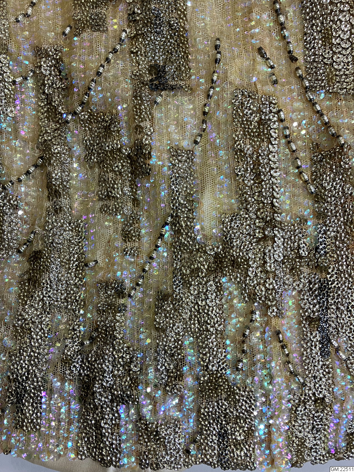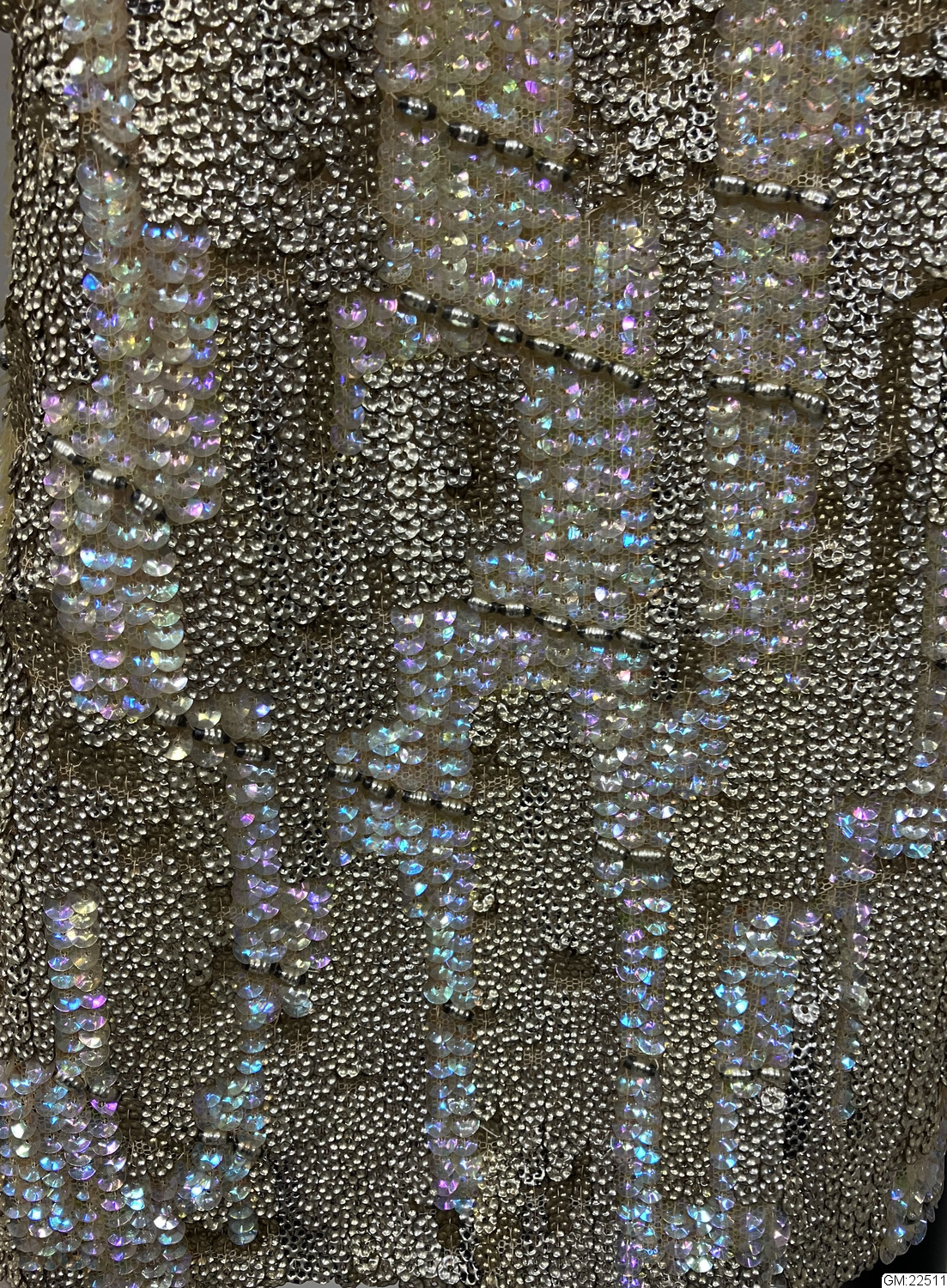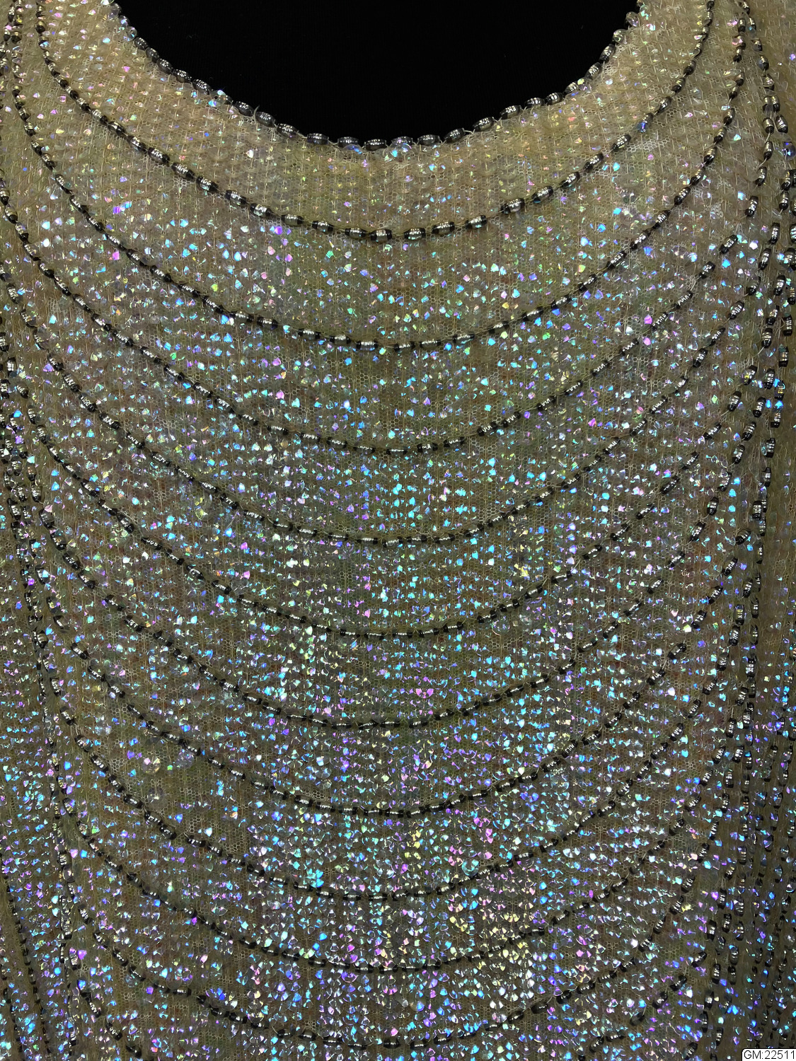 Aftonklänning i rak modell av paljett- och bärlbroderad tyll. Ärmlös,djupt urringad och knälång modell. Klänningen är helt övertäckt av skimrande gelatinpaljetter och guldfärjade pärlor på överdelen och i nederkant även guldfärgade präglade metallpaljetter. Helfodrad av cremfärgat siden. Under ärmarna sitter svettlappar.