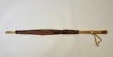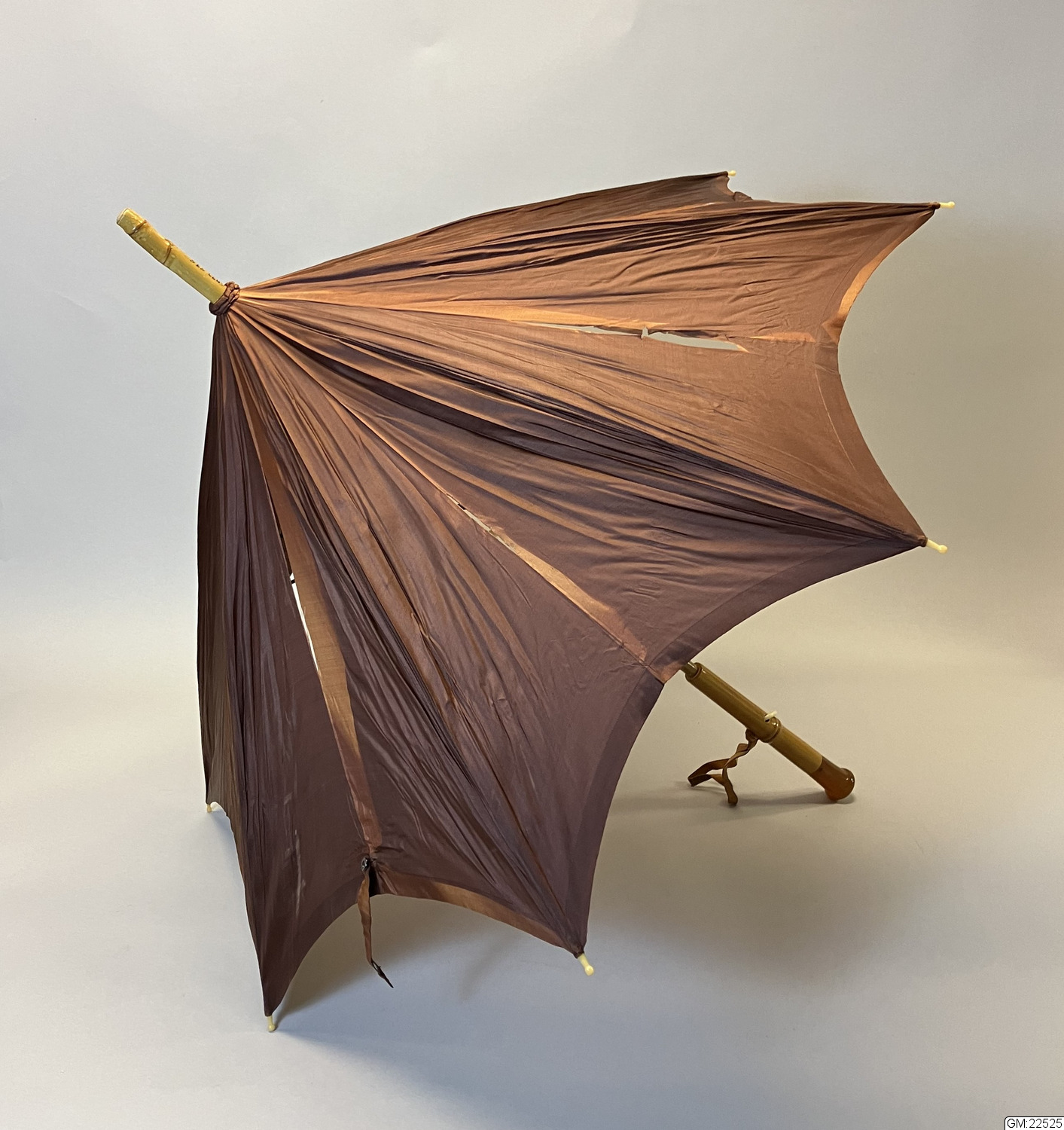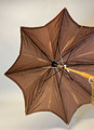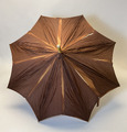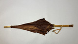 - Parasoll i brunt siden. Stomme i trä och metall. Handtag i trä (bambu?) med knapp i celluloid (eventuellt). Piggar av celluloid (?) och på handtaget sitter en handrem av brunt läder med fäste av ben. Parasollet har ett band för att hålla ihop det i nedfällt läget som fästs med en knapp och metallring.