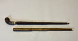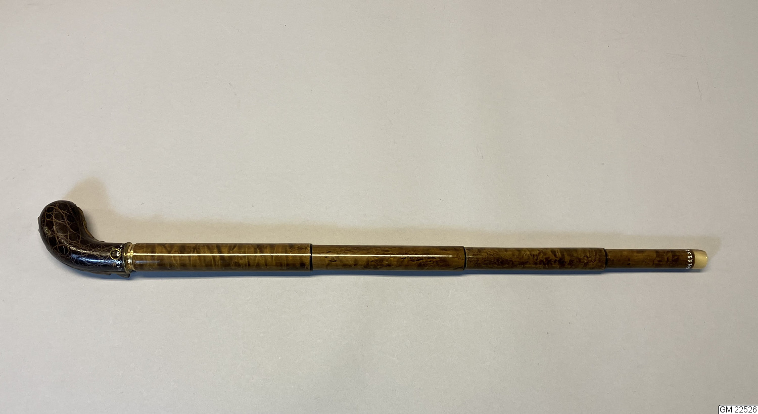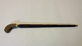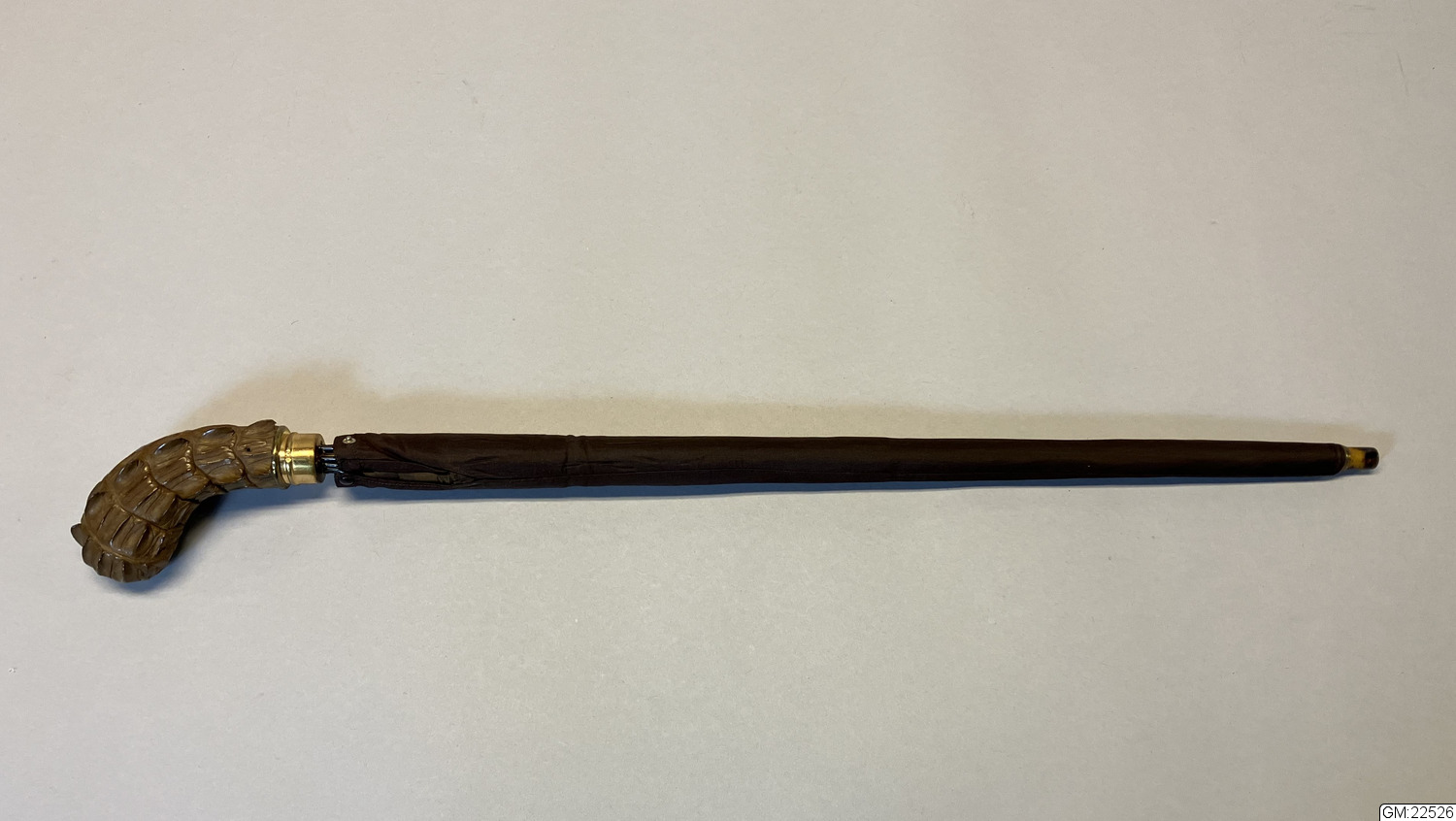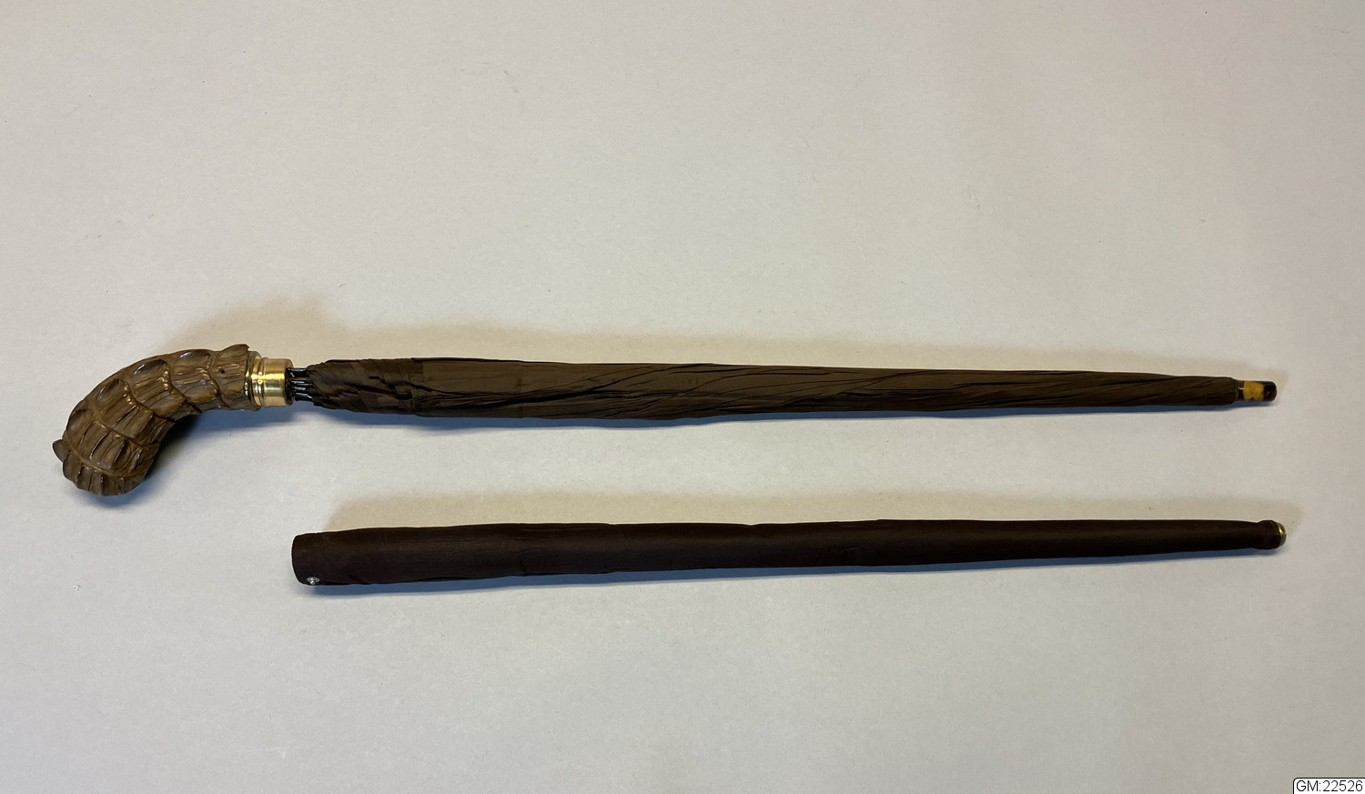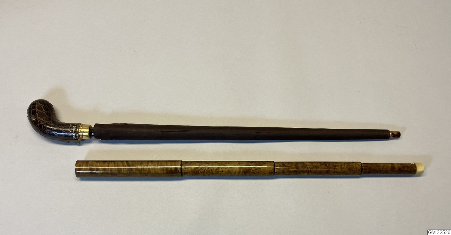 - Paraply i brunt siden med överdrag i brunt siden samt hårt fodral i träfaner (?). Paraplyet har stomme i metall och handkrycka klätt i krokodilskinn och fästet i guldfärgad metall. Doppsko i sköldpadd, eventuellt celluloid. Överdraget i brunt är långsmalt med ett hål med metallskoning i botten och i andra änden knäppning med tryckknappning. Fodralet är av teleskoptyp och de översta delarna går att skjuta ihop, i botten av fodralet en ring i horn.