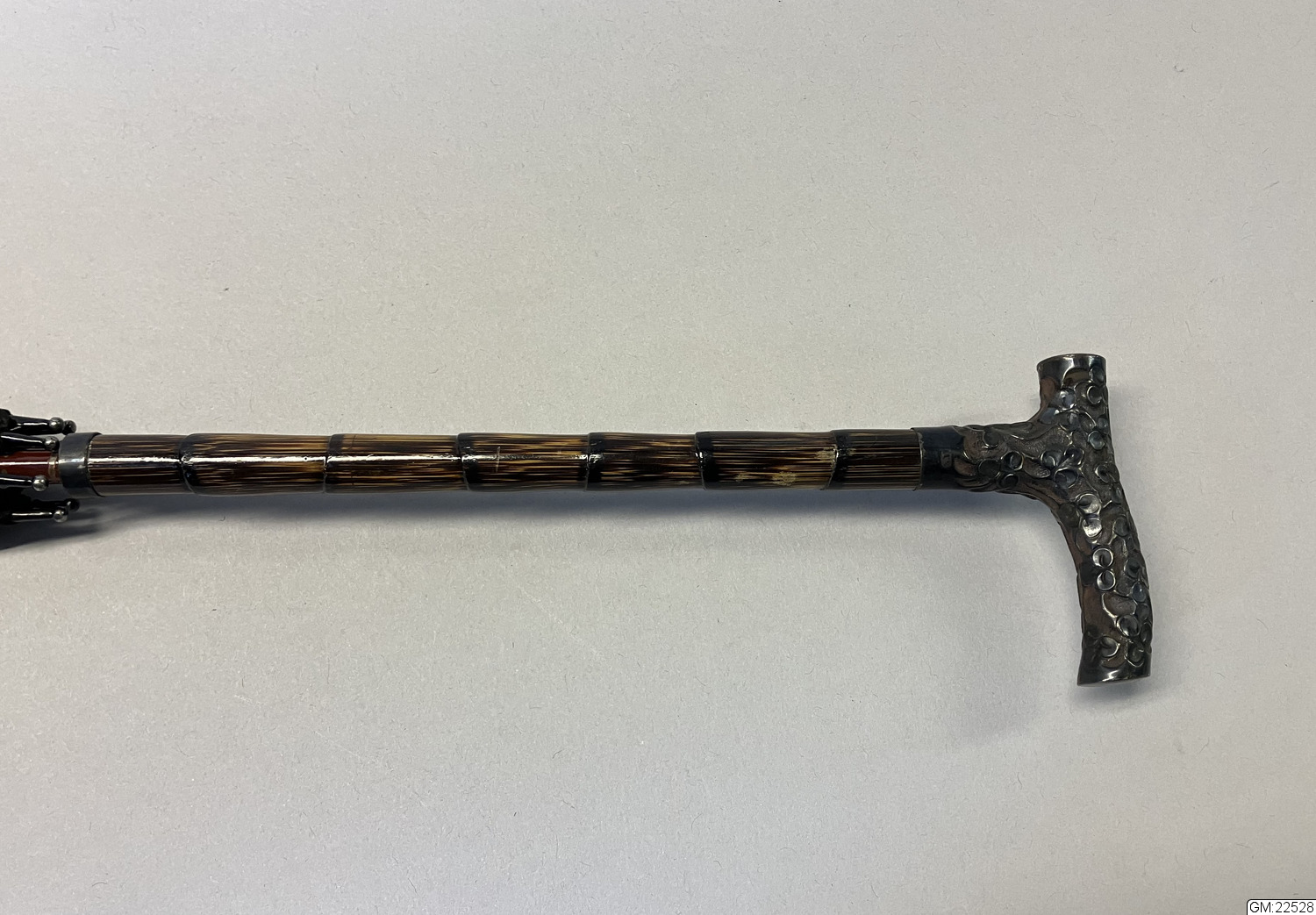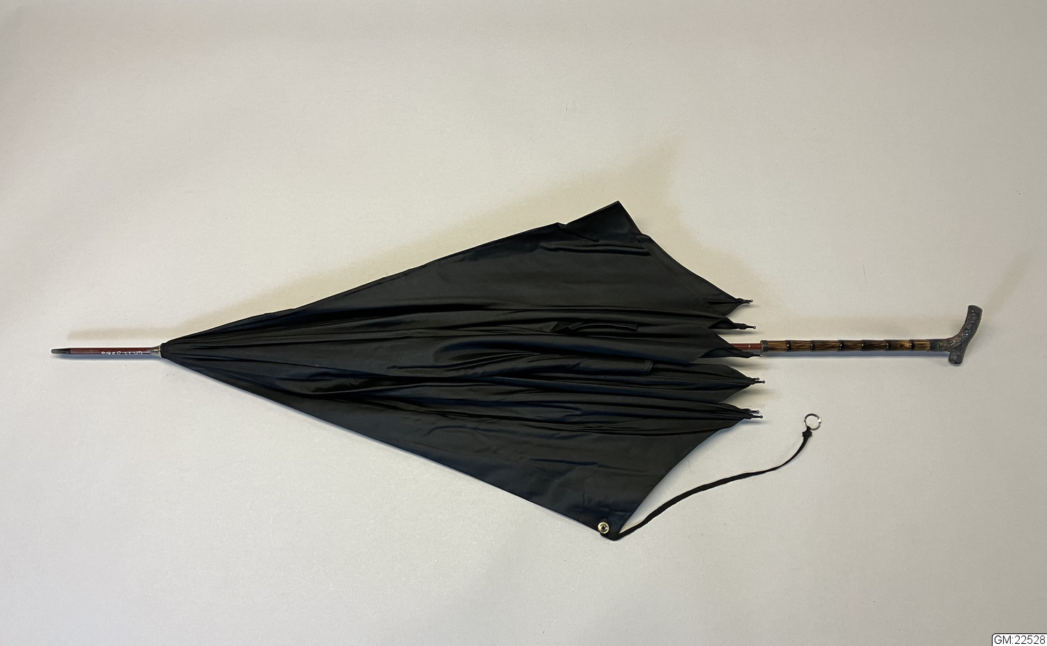 - Paraply i svart siden. Stomme i metall. Handtag i ådringsmålat trä (bambu?) med krycka av metall med strukturmönster av bladslingor. Långsmal topp metall. Parasollet har en snodd för att hålla ihop det i nedfällt läget som fästs med knapp och ring.