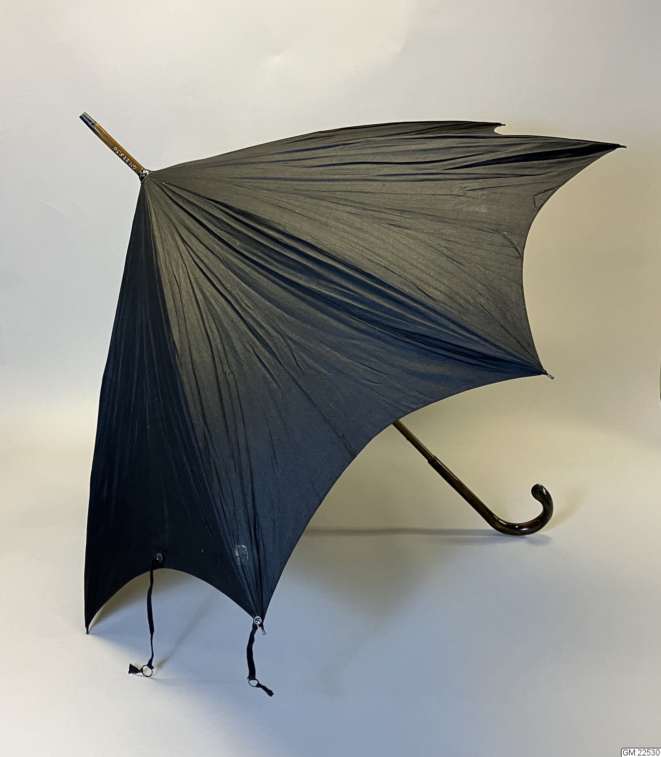 Paraply i svart kypertvävd bomull. Stomme i trä och metall. Böjt handtag i trä. Parasollet har två band för att hålla ihop det i nedfällt läge, ett som fästs med knapp och metallring och ett annat längre som fästs vid piggarna.