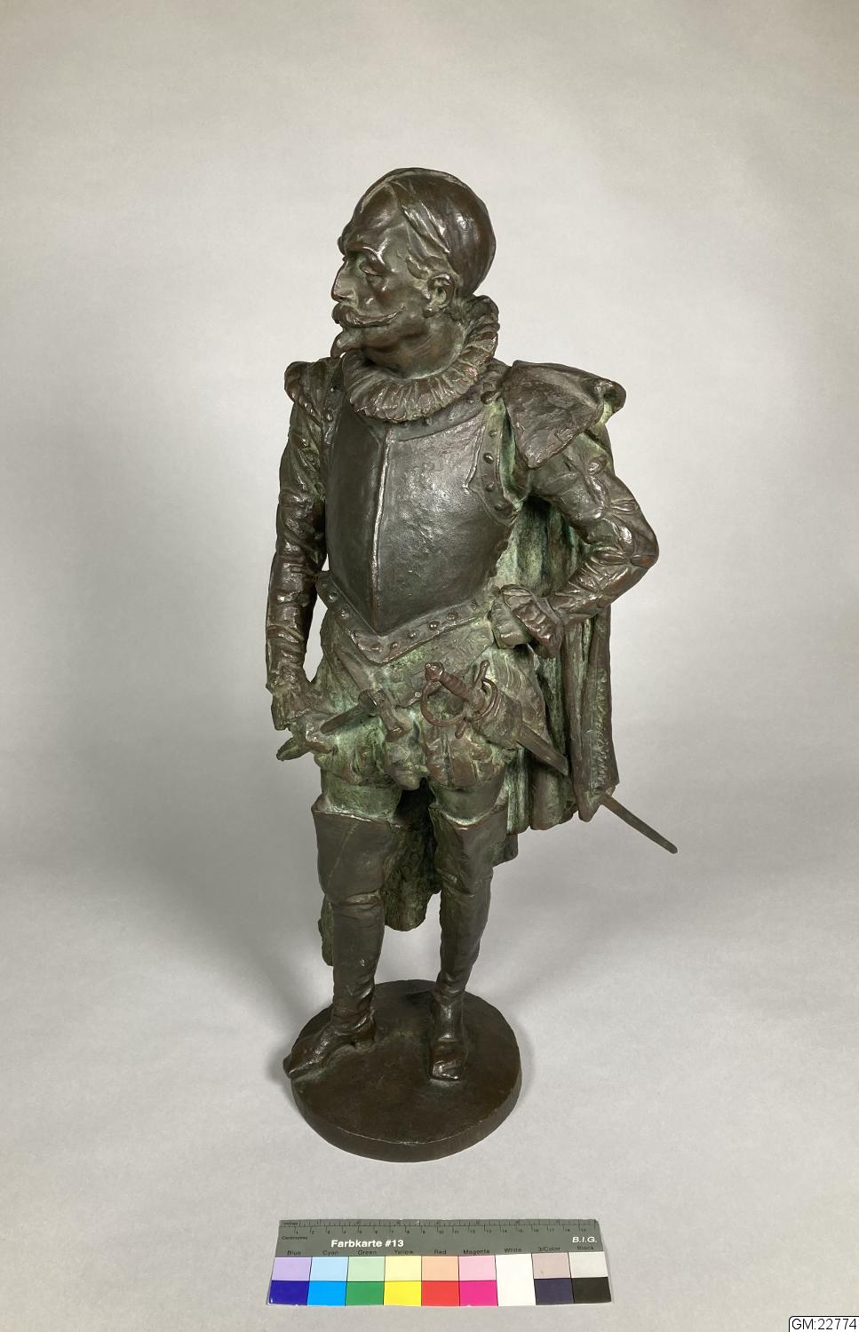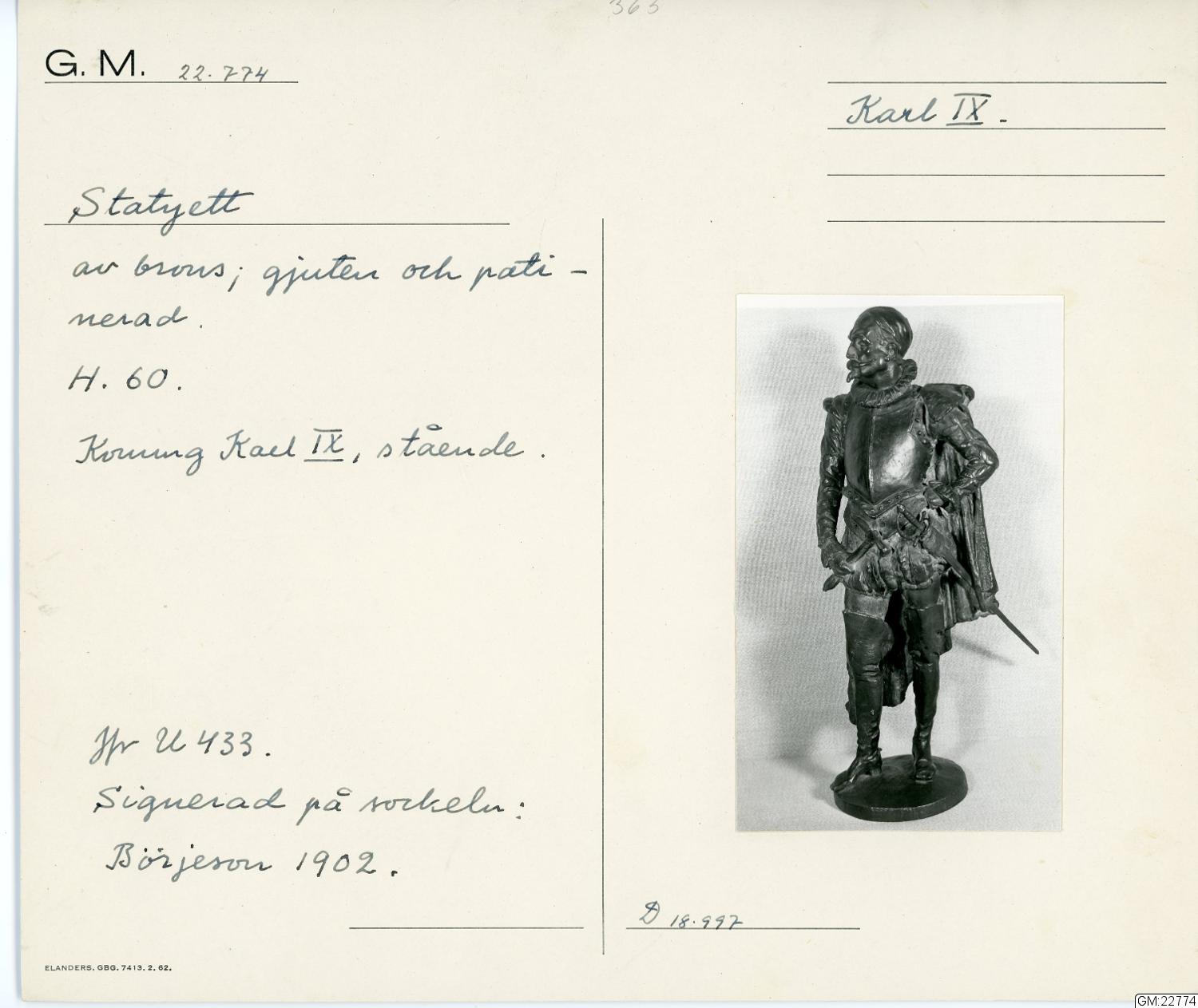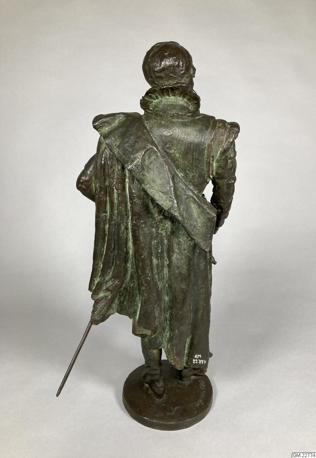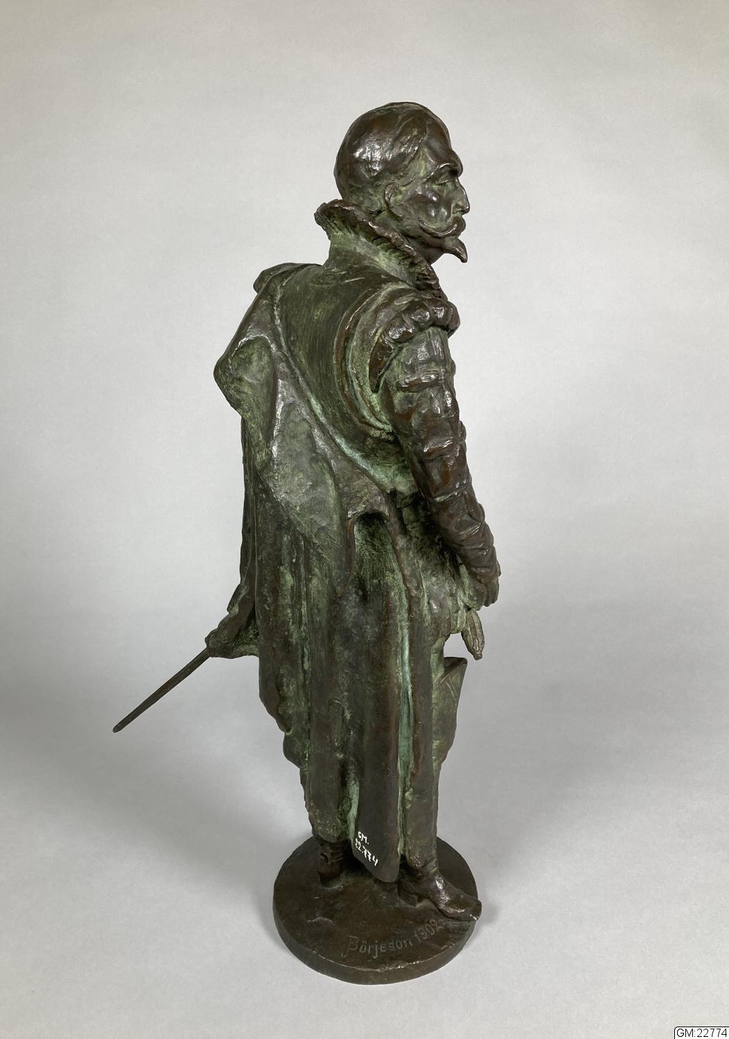 - Denna statyett är gjuten efter en modell i plastelina som konstnären ställde ut på Valand när stadens främsta skulle välja hur det kommande monumentet av Karl IX skulle se ut. Två modeller ställdes ut, denna fotstaty samt en ryttarstaty. Modellen av fotstatyn gav konstnären till överste Albert Fredrik Jacobsson 1902, initiativtagare till monumentet, som senare efter många om och men fick gjuta den i brons.