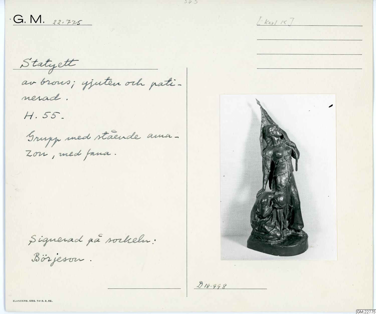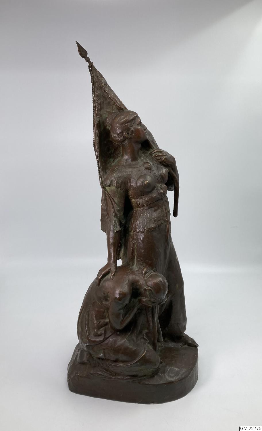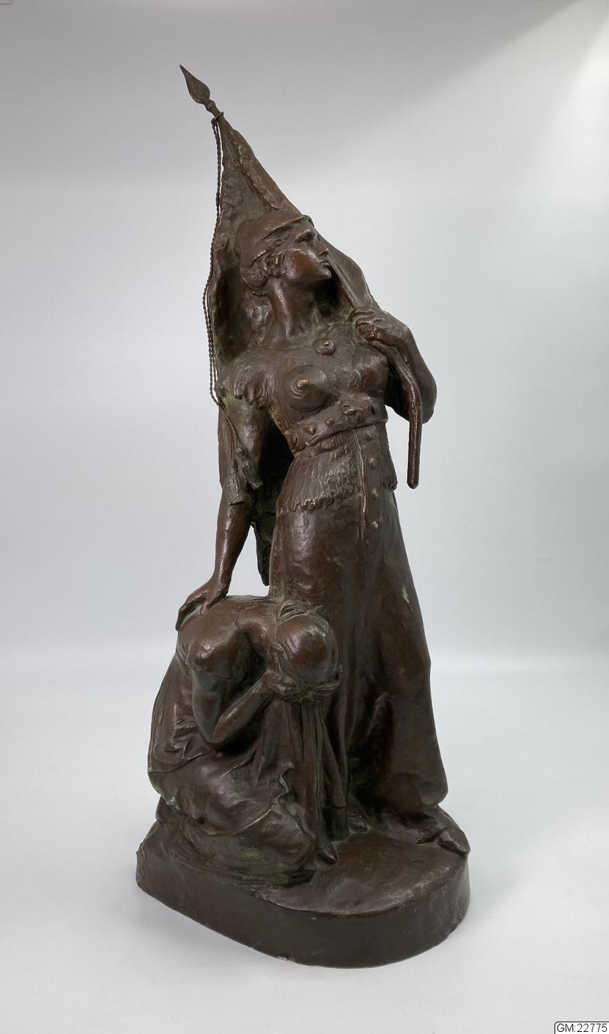 - Denna statyett är gjuten efter en modell i plastelina som konstnären ställde ut på Valand när man skulle välja hur det kommande monumentet av Karl IX skulle se ut. Monumentets piedestal var tänkt att ha denna figurgrupp på framsidan. Denna piedestal blev bortröstad och den vi kan se under ”Kopparmärra” idag är ritad av Isak Gustaf Clason. Konstnären gav modellen till överste Albert Fredrik Jacobsson, initiativtagare till monumentet, som senare efter många om och men fick gjuta den i brons. Den ska enligt konstnären symbolisera att det Karl IX ”…gjorde af grymhet och hänsynslöshet, det gjorde han ej för egen del, utan allt för fosterlandet!”.