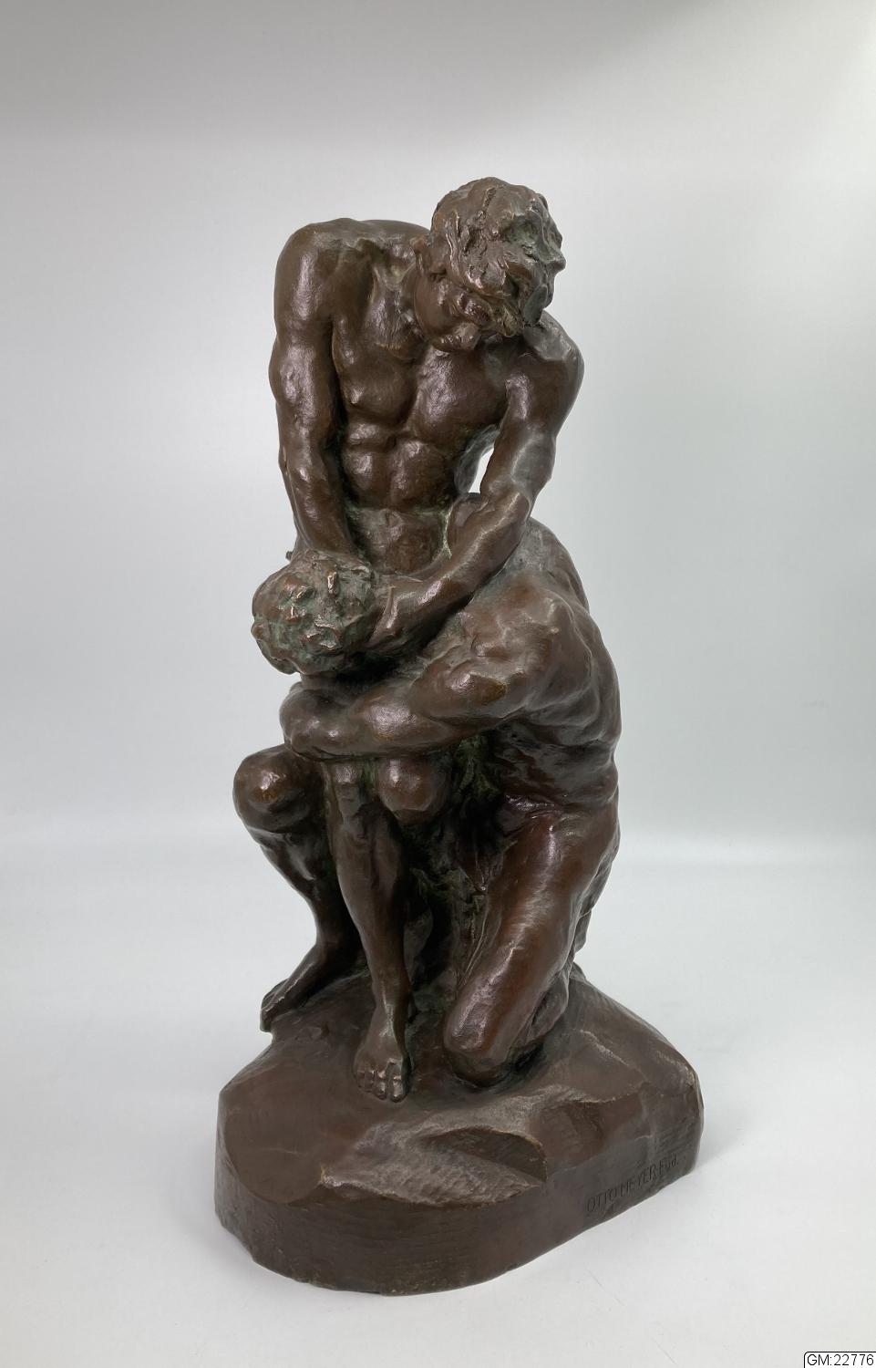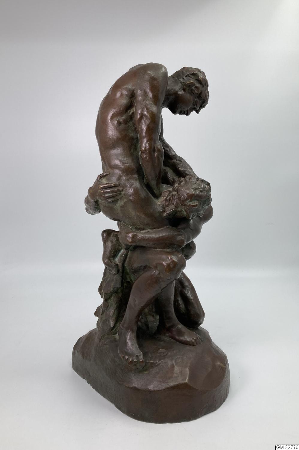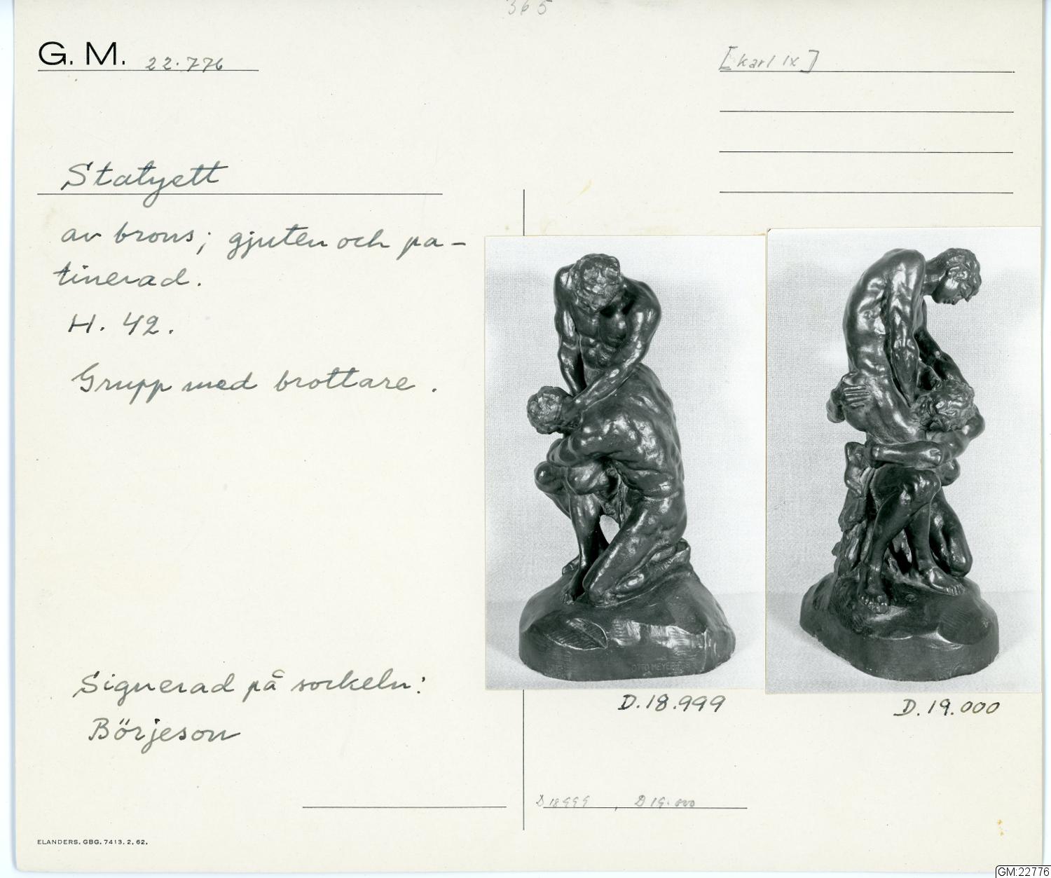 - Denna statyett är gjuten efter en modell i plastelina som konstnären ställde ut på Valand när man skulle välja hur det kommande monumentet av Karl IX skulle se ut. Monumentets piedestal var tänkt att ha denna figurgrupp på baksidan. Denna piedestal blev bortröstad och den vi kan se under ”Kopparmärra” idag är ritad av Isak Gustaf Clason. Konstnären gav modellen till överste Albert Fredrik Jacobsson, initiativtagare till monumentet, som senare efter många om och men fick gjuta den i brons. Den skulle enligt konstnären symbolisera ”…den brytningstid, som han lefde i å der han gick fram nedtrampande allt som ställde sig i hans väg för att röja väg för efterkommande tider.”
