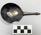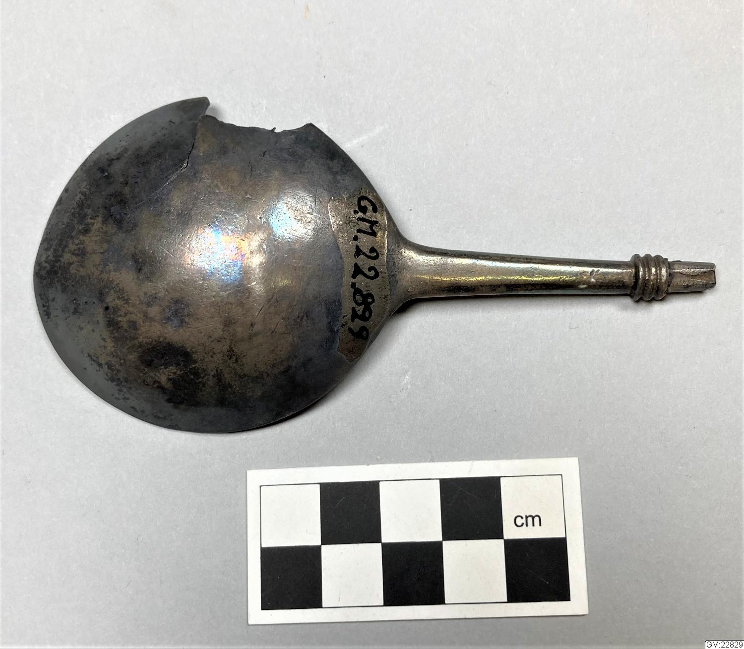 - Silversked med kort skaft och rundat blad. Knoppen avbruten, saknas. I bladets ena kant en spricka och en defekt. Upptill på skaftet 3 ornamentala vulster med spår av förgyllning. I bladets inskida en förgylld, graverad dekor, bestående av en bandslinga med minuskelliknande tecken samt en sköld med minuskeln (?). Under denna är bomärket ( ) inkratsat. (Text enligt katalogkort)