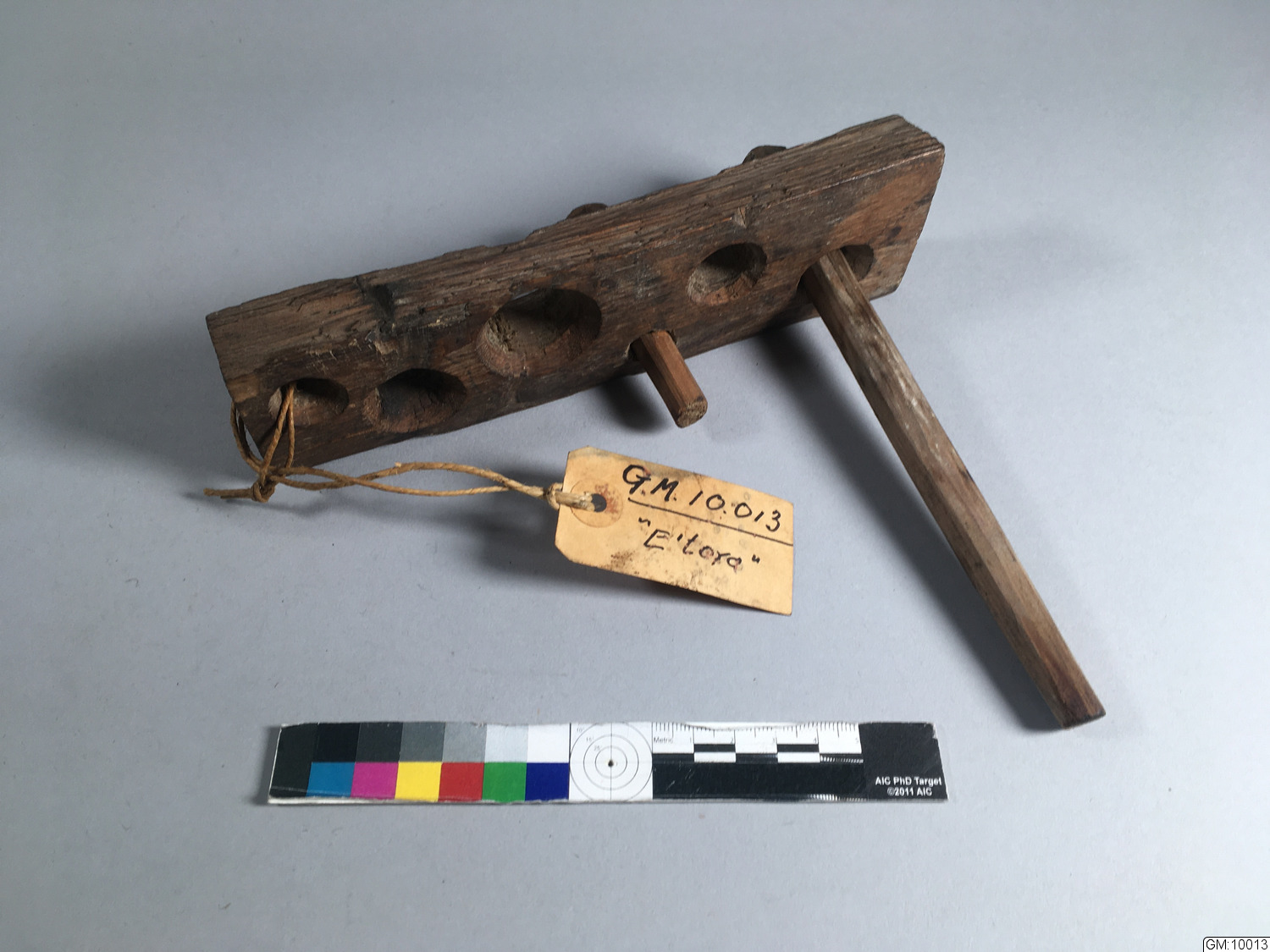 till naglar; E´tora, ekbit med hål till 6 tränaglar. 4 naglar av gran