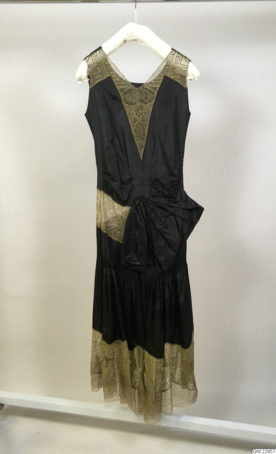 Klänning av svart taft, guldspets och tyll. Långt liv med ett parti av guldspets infällt nedanför midjehöjd. På framstycket är spetsen påsydd i en uppåtgående linje, på bakstycket i en nedåtgående. Ärmlös. Rund, djup halsringning fram. I nacken, V-formad, infälld spets, som går ut över axeln och nedöver ryggen. Tvärgående, korta veck i sidorna och på bakstycket. Kjolen är sydd till livet med flera rynkrader. Den avslutas i kanten med en 19 cm bred spets, sydd till kjolen i uddar. Ett 4 cm brett tagelband är fästat i spetsens överkant på avigsidan. Spetsens nederkant avslutas med en dubbel tyllkant varpå broderats ett mönster i slingor, sytt med guldtråd i kedjestygn. En rosett av tyget 30 cm bred, i mitten hopdragen med täta rynkrader till 5 cm bred, är fästad på bakstycket. Längd fram: 128 cm, bak: 137 cm, vidd: 297 cm.
