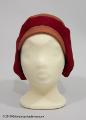- damhatt av konstfiber och filt i två nyanser rött. Brättet, av filt, är i sidorna uppklippt och draperat, fram är den uppvikt tätt intill kullen. Konstsidenfoder med påsytt firmanamn