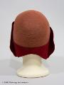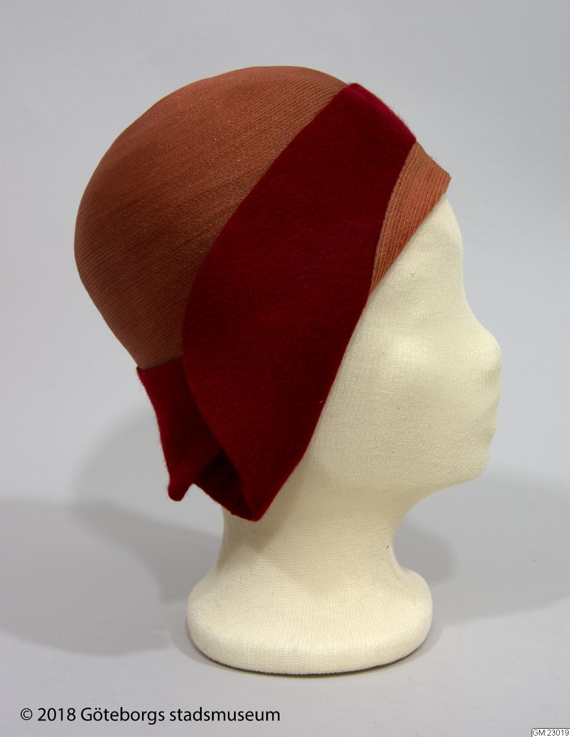 - Från katalogkort: Damhatt av konstfiber och filt i två nyanser av rött. Brättet, av filt, är i sidorna uppklippt och draperat, fram är det uppvikt tätt intill kullen. Konstsidenfoder med påsytt firmanamn: Gillblads, Göteborg.