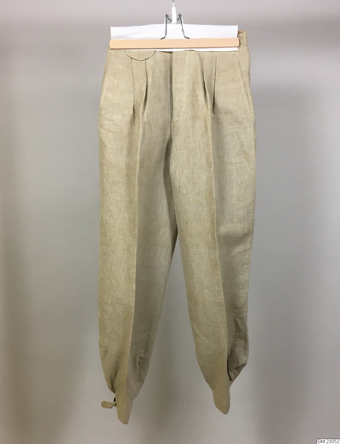 Sportbyxor för herre av oblekt linne. Knäbyxor, knäppes nedanför knäet med sölja. Fickor i sidosömmarna, två bakfickor samt liten ficka med ficklock vid linningen. Dragsko för livrem. Vita benknappar. Längd: 116 cm, efter baksömmen.