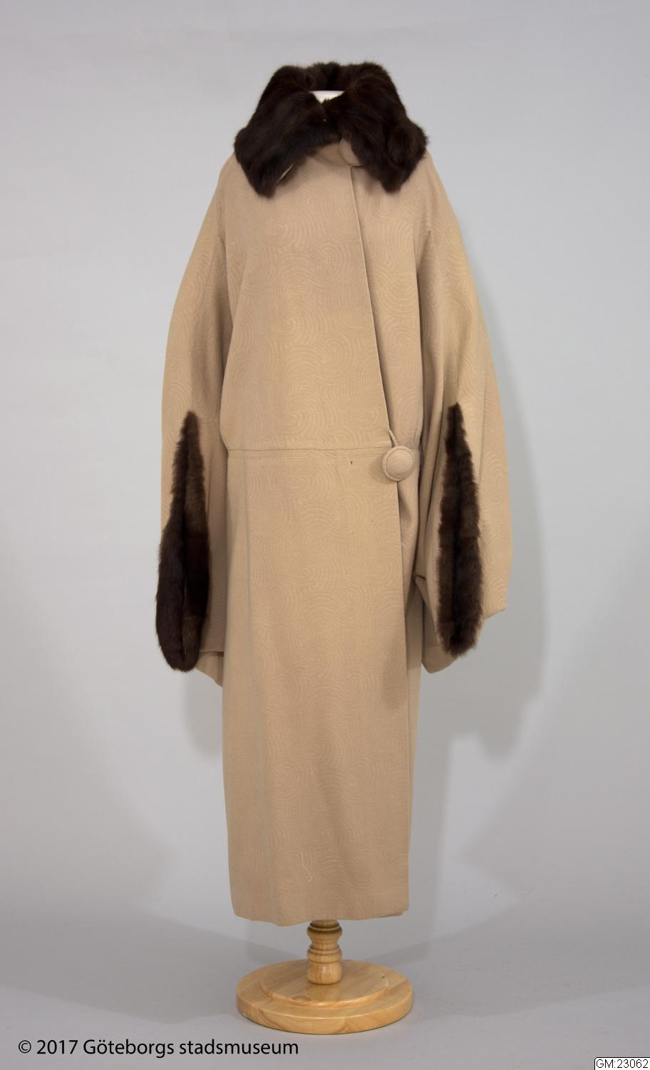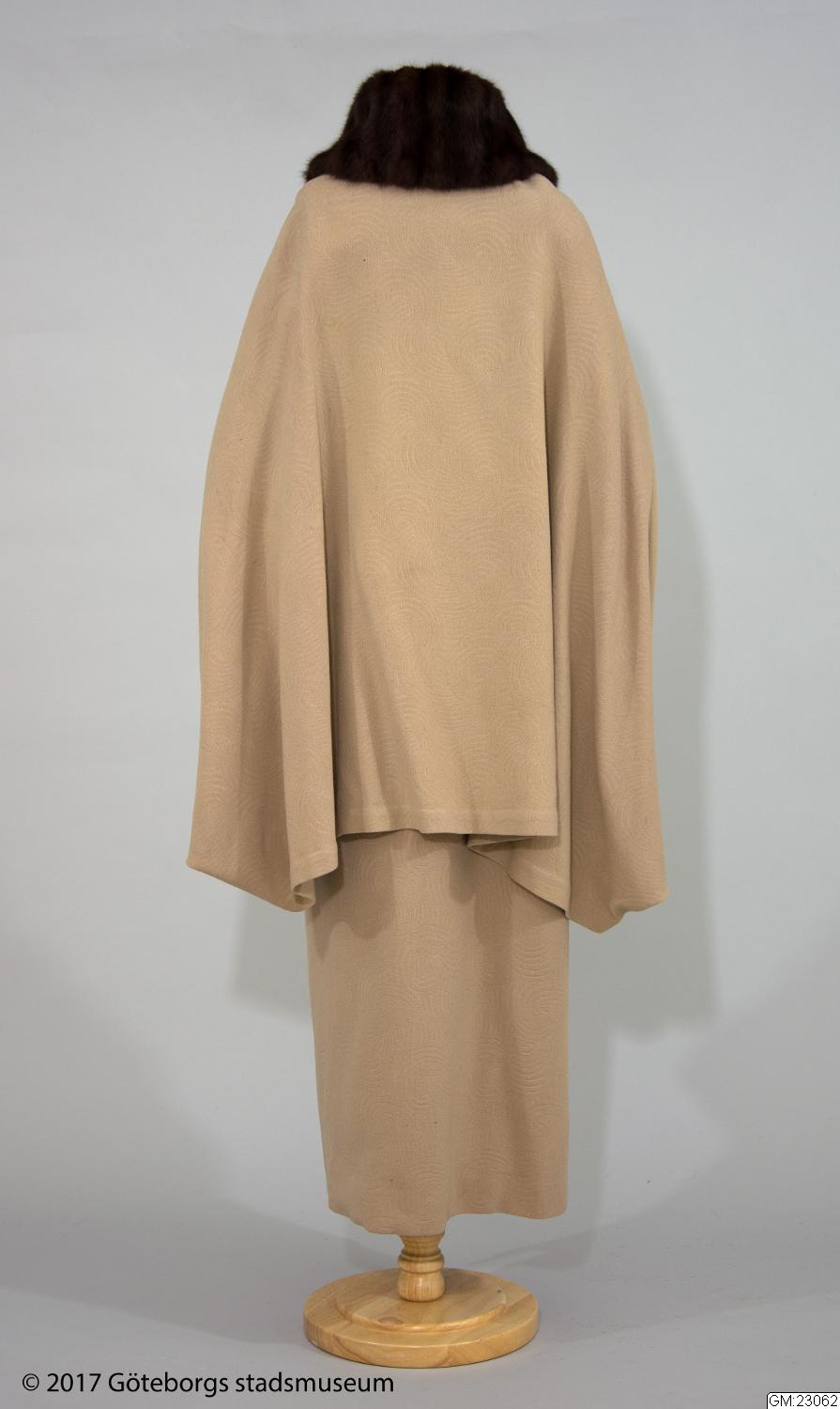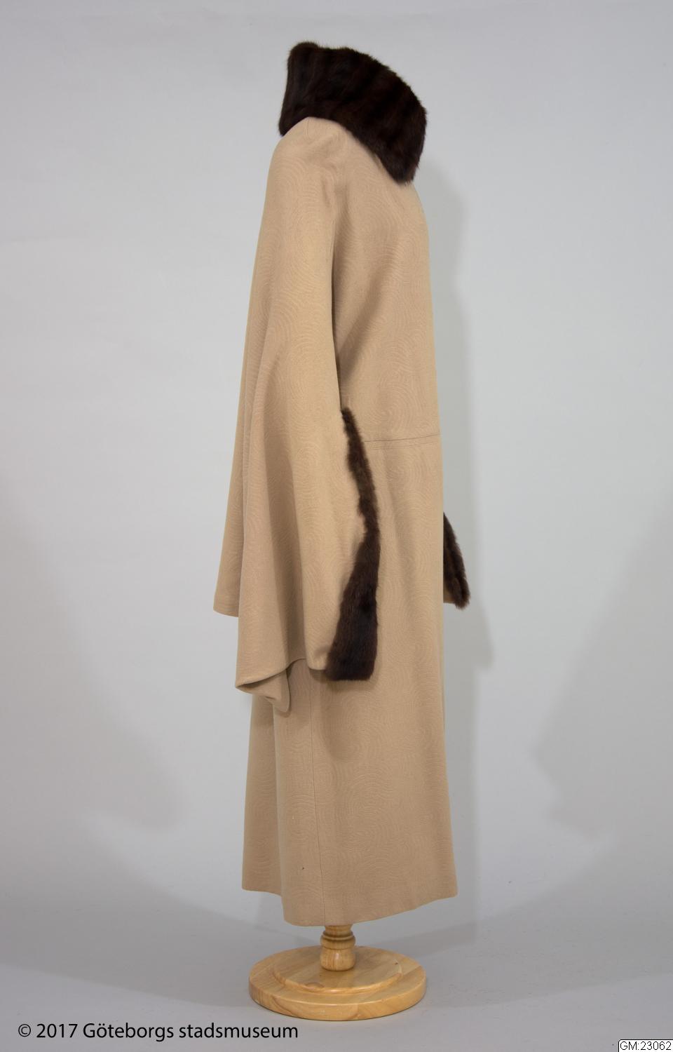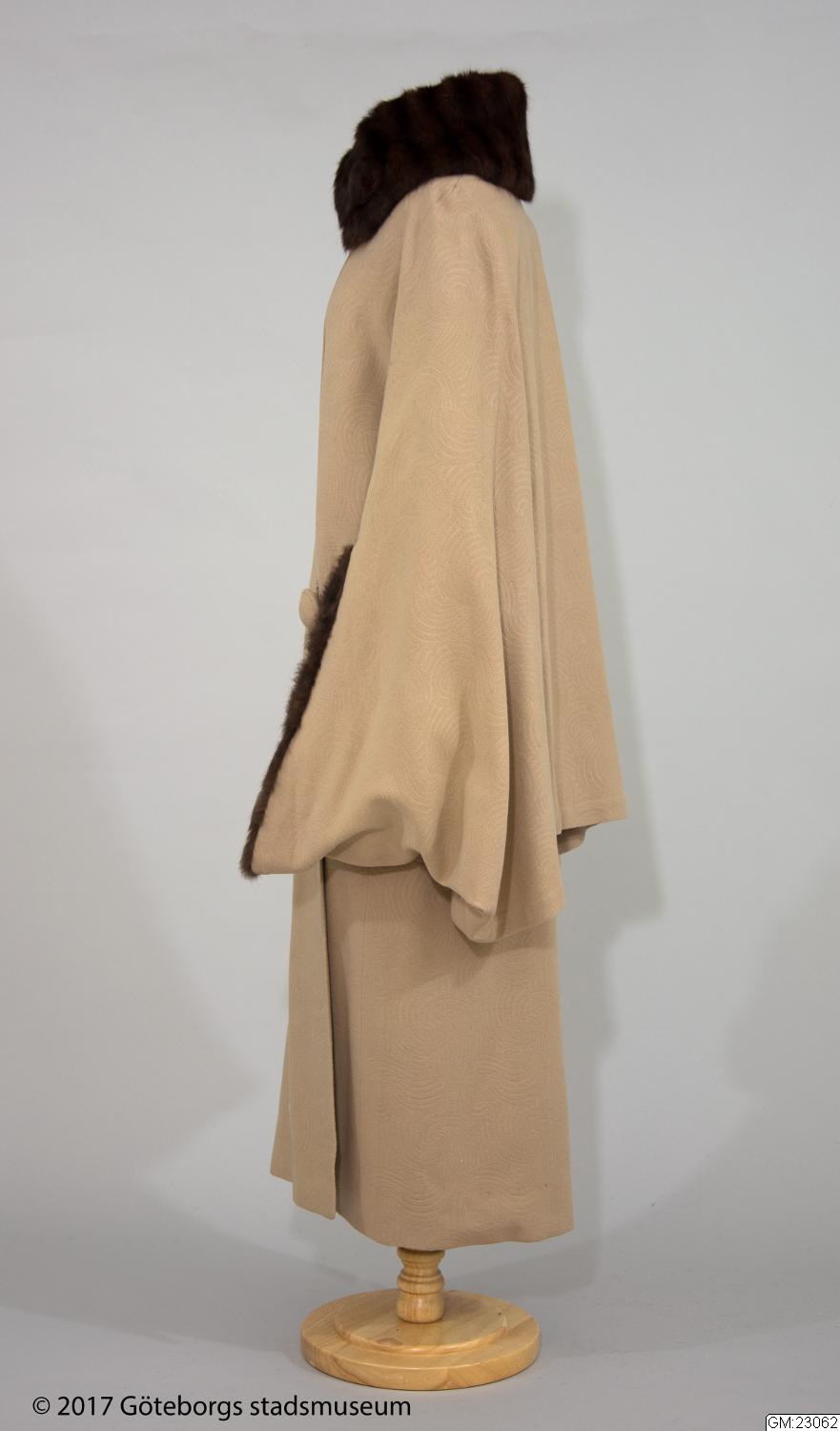 Kappa med cape av beigefärgad yllecloqué. Skuren i tre stycken med hel rygg och lågt avskurna framstycken. Framstyckets överdel, lätt sneddad i framkanten, har ett litet rynkparti i var sida och är med en smal, infälld slå sammansydd med nederdelen. Knäppes med två stora överklädda knappar och hankar av tyget. Capen bildar också ärm där den vida ärmöppningen kantas av päls. Pälskrage av samma skinn. Foder av crepe de chine med ficka. Firmamärke: AB Nordiska Kompaniet Kungl. Hofleverantör Stockholm samt på baksidan; Grev:an Bl. Bonde 5/6 1923. Längd: 134 cm, capens längd: 83 cm.