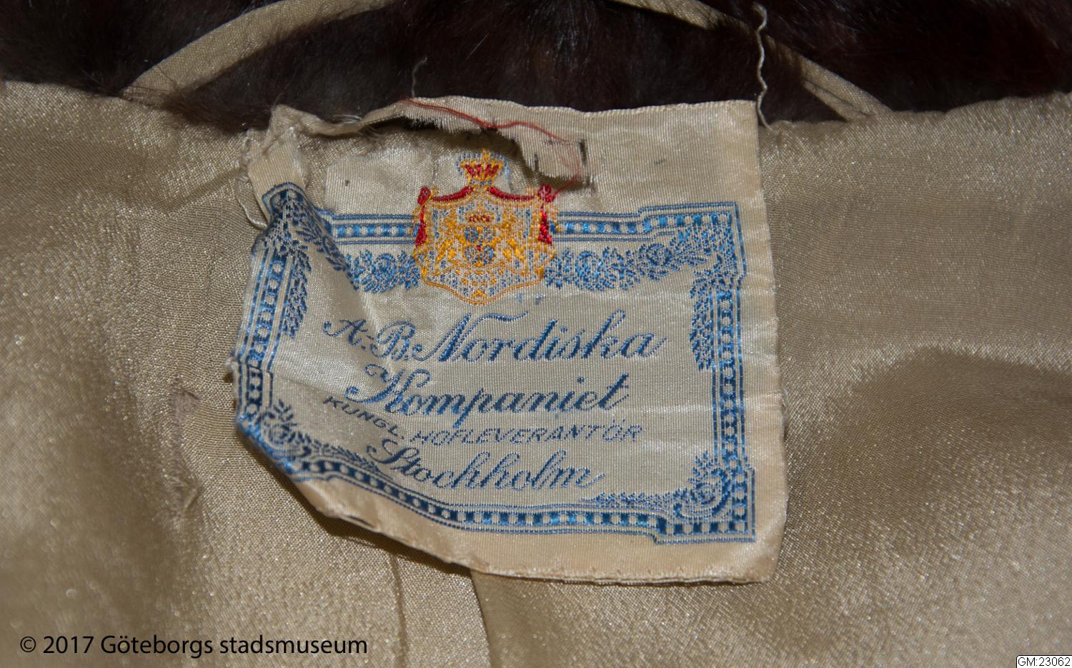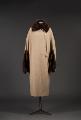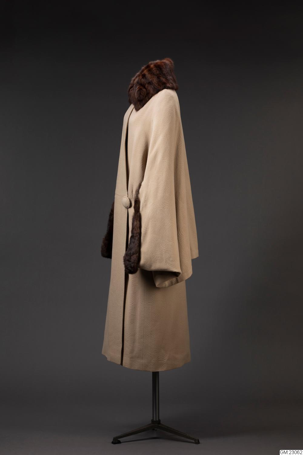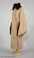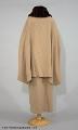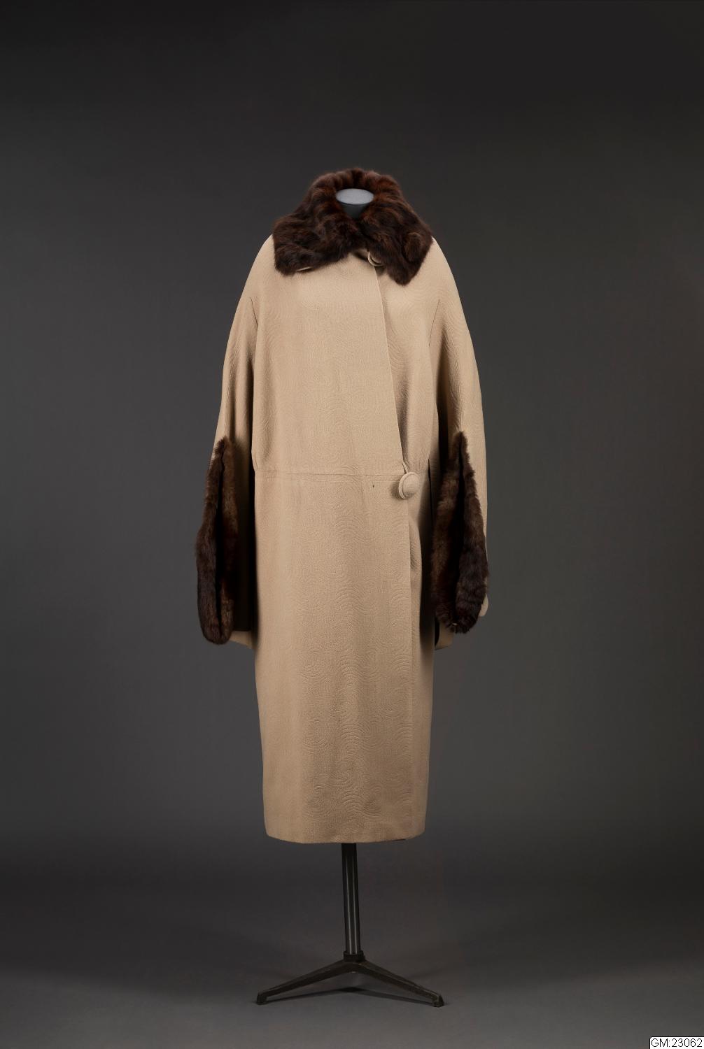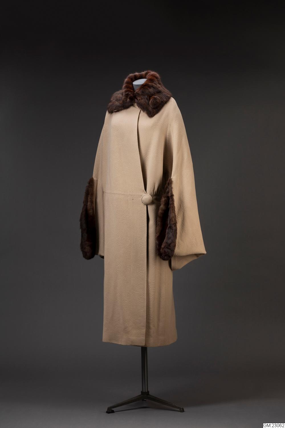 Kappa med cape av beigefärgad yllecloqué. Skuren i tre stycken med hel rygg och lågt avskurna framstycken. Framstyckets överdel, lätt sneddad i framkanten, har ett litet rynkparti i var sida och är med en smal, infälld slå sammansydd med nederdelen. Knäppes med två stora överklädda knappar och hankar av tyget. Capen bildar också ärm där den vida ärmöppningen kantas av päls. Pälskrage av samma skinn. Foder av crepe de chine med ficka. Firmamärke: AB Nordiska Kompaniet Kungl. Hofleverantör Stockholm samt på baksidan; Grev:an Bl. Bonde 5/6 1923. Längd: 134 cm, capens längd: 83 cm.