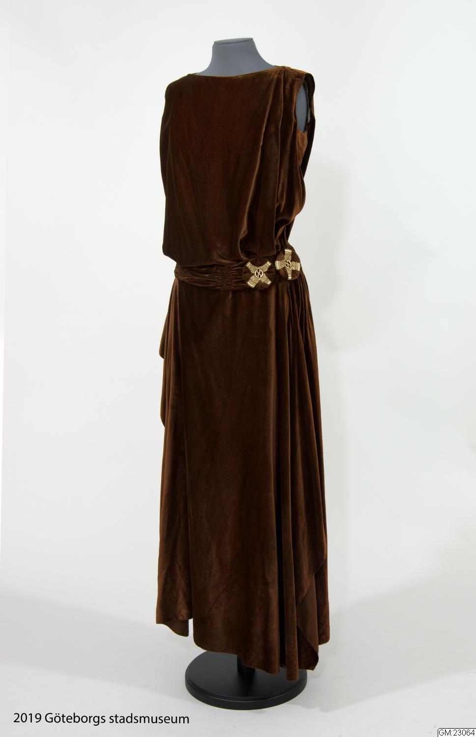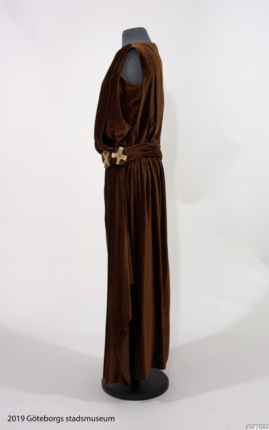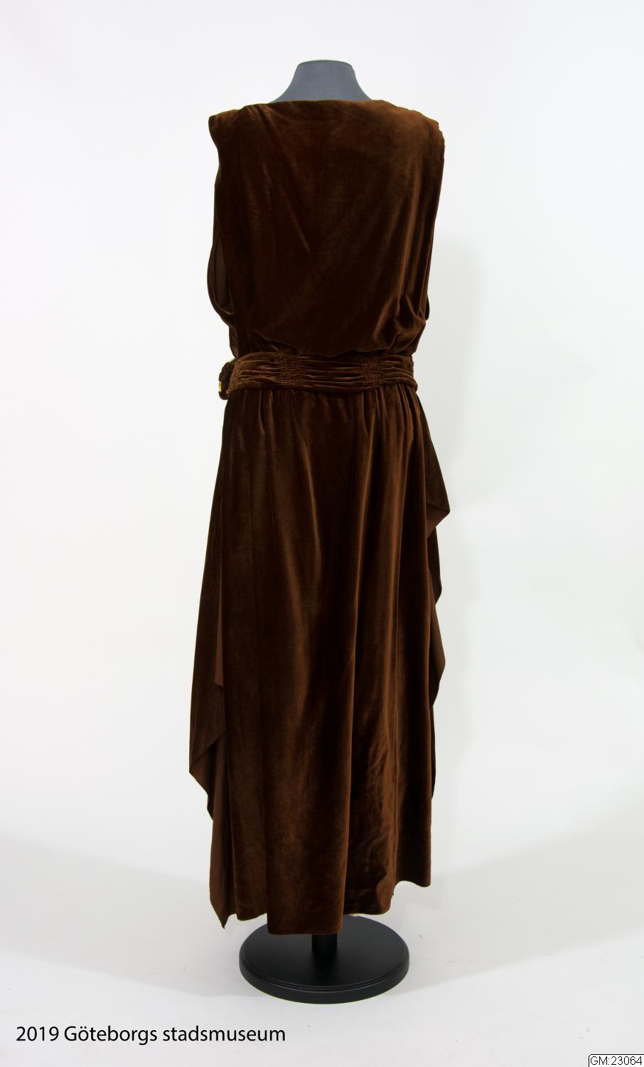 Klänning, av brunt spegelsammet. Rak, ärmlös modell med båtformig halsringning. Långt slätt liv som knäppes i vänster sida, med början på axeln. Löst foderliv av tyll, över axlarna och i sidorna klätt med sammet. Knäppes till klänningen med tryckknappar. Firmastämpel: Augustia Lundin, 20 Brunkebergstorg, Stockholm. Kjolen består av två stycken, helt öppna och omlottlagda, sammanhållna på undersidan av resårband. Draperingr i båda sidor. Skärp med grupper av rynkrader. Dubbelt spänne av ben med utskuret mönster och delvis klätt med sammet. Längd: 138 cm, vidd 225 cm