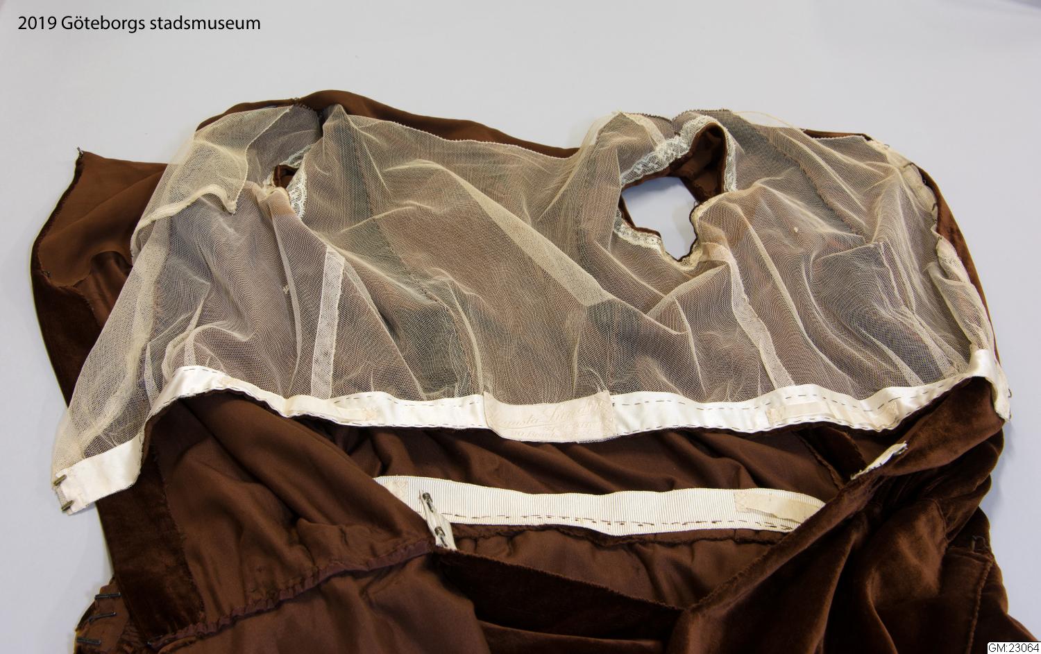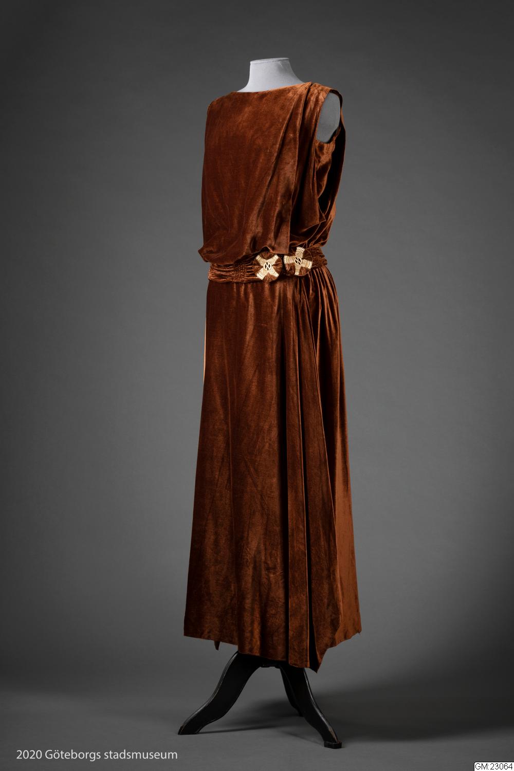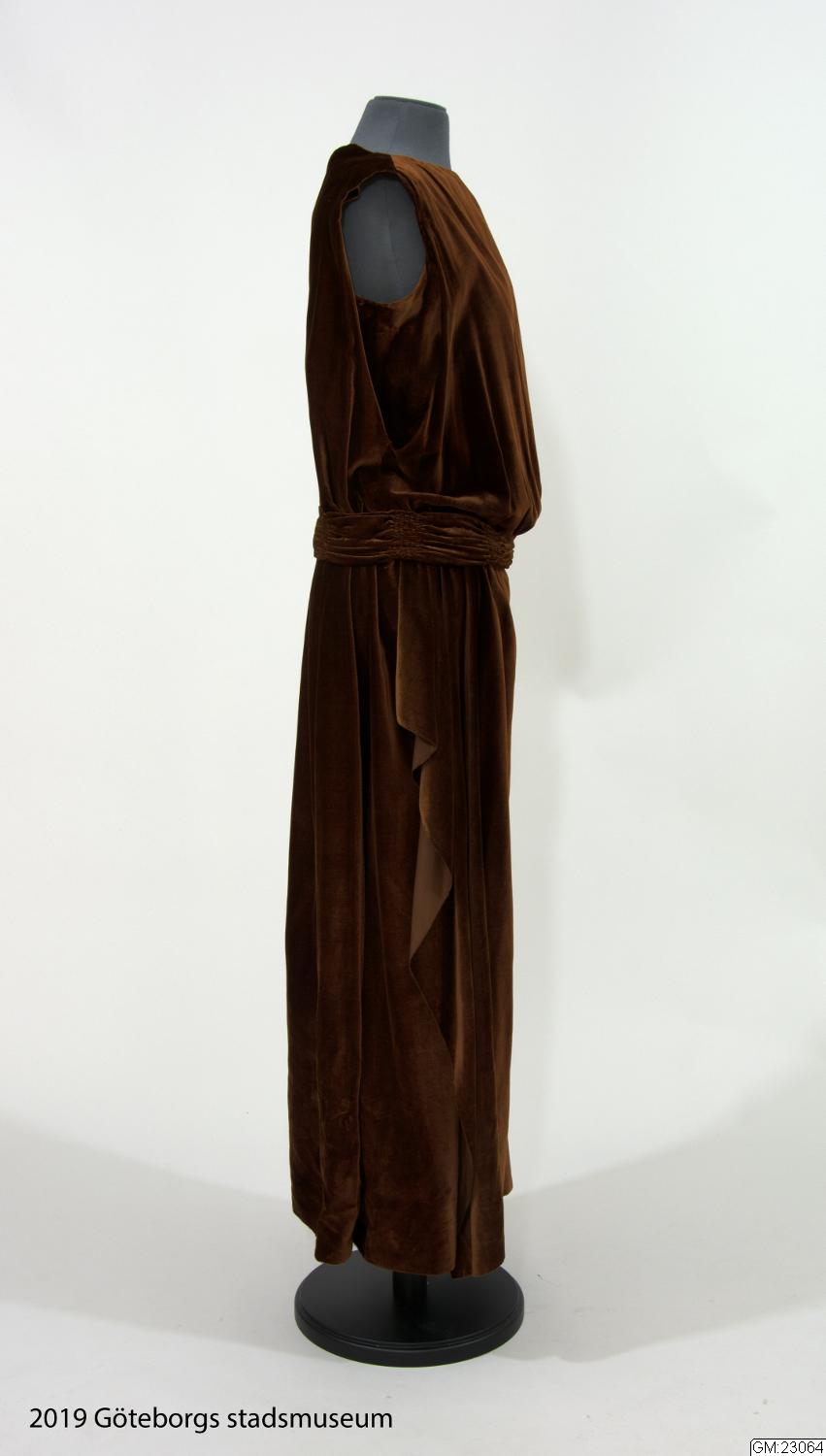 Klänning, av brunt spegelsammet. Rak, ärmlös modell med båtformig halsringning. Långt slätt liv som knäppes i vänster sida, med början på axeln. Löst foderliv av tyll, över axlarna och i sidorna klätt med sammet. Knäppes till klänningen med tryckknappar. Firmastämpel: Augustia Lundin, 20 Brunkebergstorg, Stockholm. Kjolen består av två stycken, helt öppna och omlottlagda, sammanhållna på undersidan av resårband. Draperingr i båda sidor. Skärp med grupper av rynkrader. Dubbelt spänne av ben med utskuret mönster och delvis klätt med sammet. Längd: 138 cm, vidd 225 cm