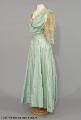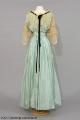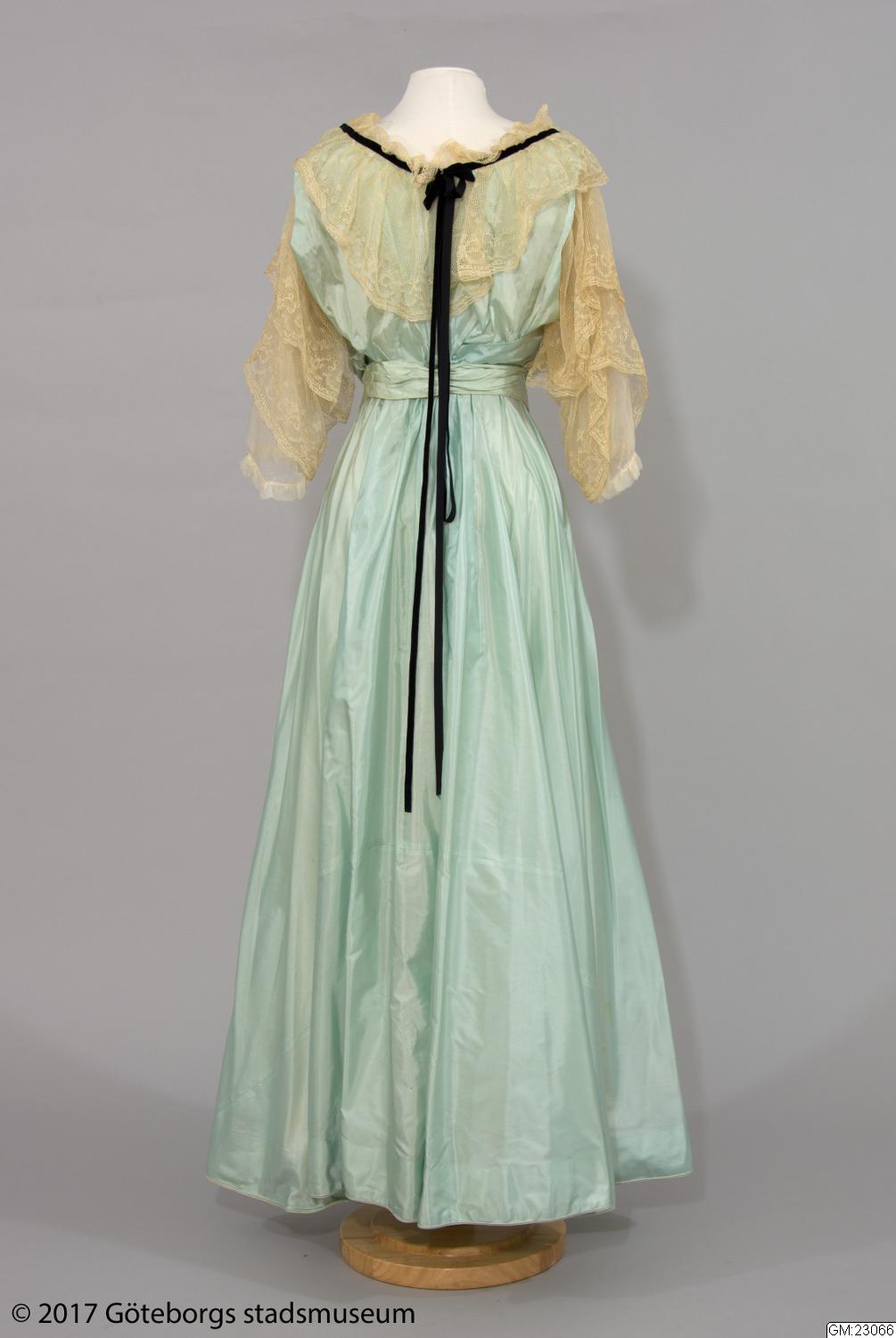 Klänning av taftsiden, ljusblått, skimrande. Liv och kjol. Livets framstycken är draperade och omlottlagda i midjan. Isättning sv filétspets. Samma spets bildar krage samt ett runt nacken uppstående krus. Smala svarta sammtesband med öglor och långa hängande ändar är fästade i nacken och följer ringningen där. Ärmen består av två spetsvolanger över chiffonärmar, som sytts på ett foderliv av siden. Detta har dragsko i halsringningen med genomträdd silkesnodd och är på framsidan inklätt med chiffon. Kjolen, halvskuren, har dubbel passpoil i nederkanten. Underkjol av vitt taftsiden. Draperat skärp med snibbform är sytt på kjolen. Livband med firmamärke: Kungl. Hofleverantör AB Nordiska kompaniet Stockholm.