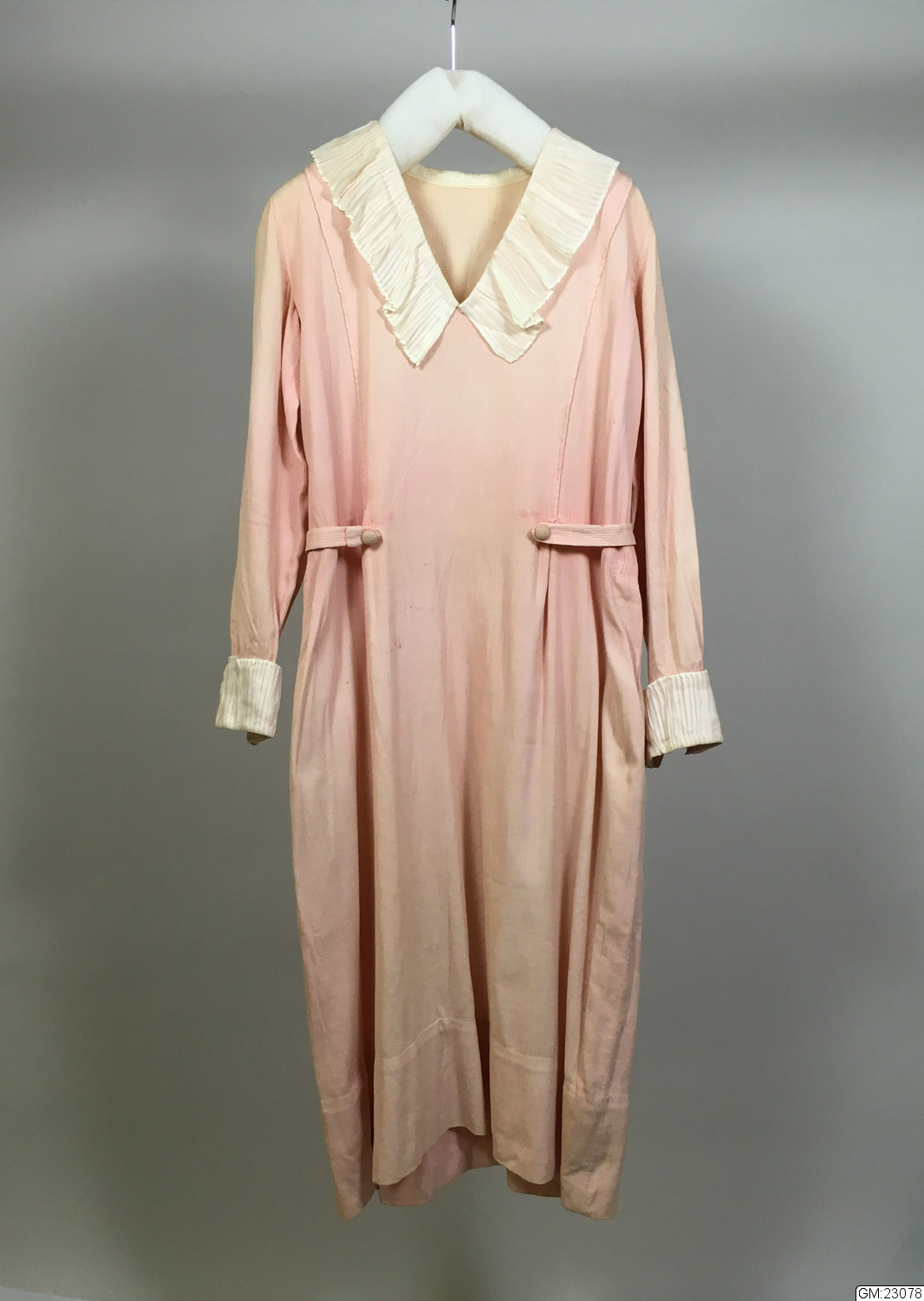 Klänning av skär piké. Helskuren modell i två stycken. Spetsig halsringning. Från axeln till midjan, på både fram- och bakstycke, ett nedsytt veck. Dragsko med resårband håller till vidden i midjan. Skärpet knäppes med tryck-knappar på ömse sidor om det nedstickade vecket på framstycket och har där två överklädda knappar. Lång ärm, rynkad till manchett och knäppes med 5 tränsar och överklädda kulknappar. Lös krage och manchetter av plisserat vitt bomullstyg. Insydda fickor i sidsömmarna. Längd: 122, vidd: 149cm, ärml. 61cm.