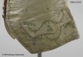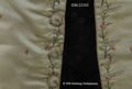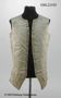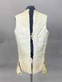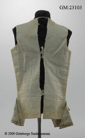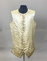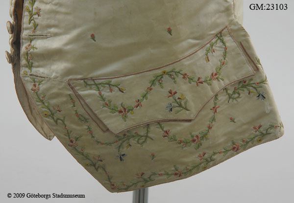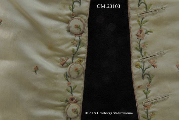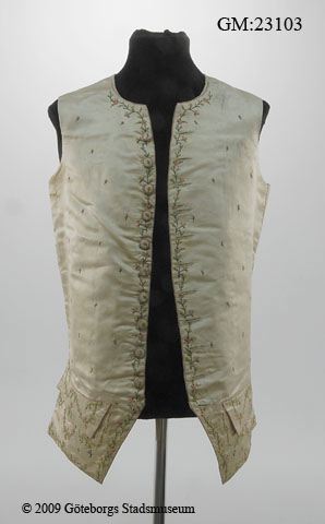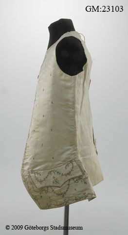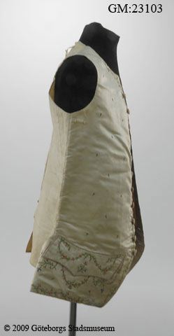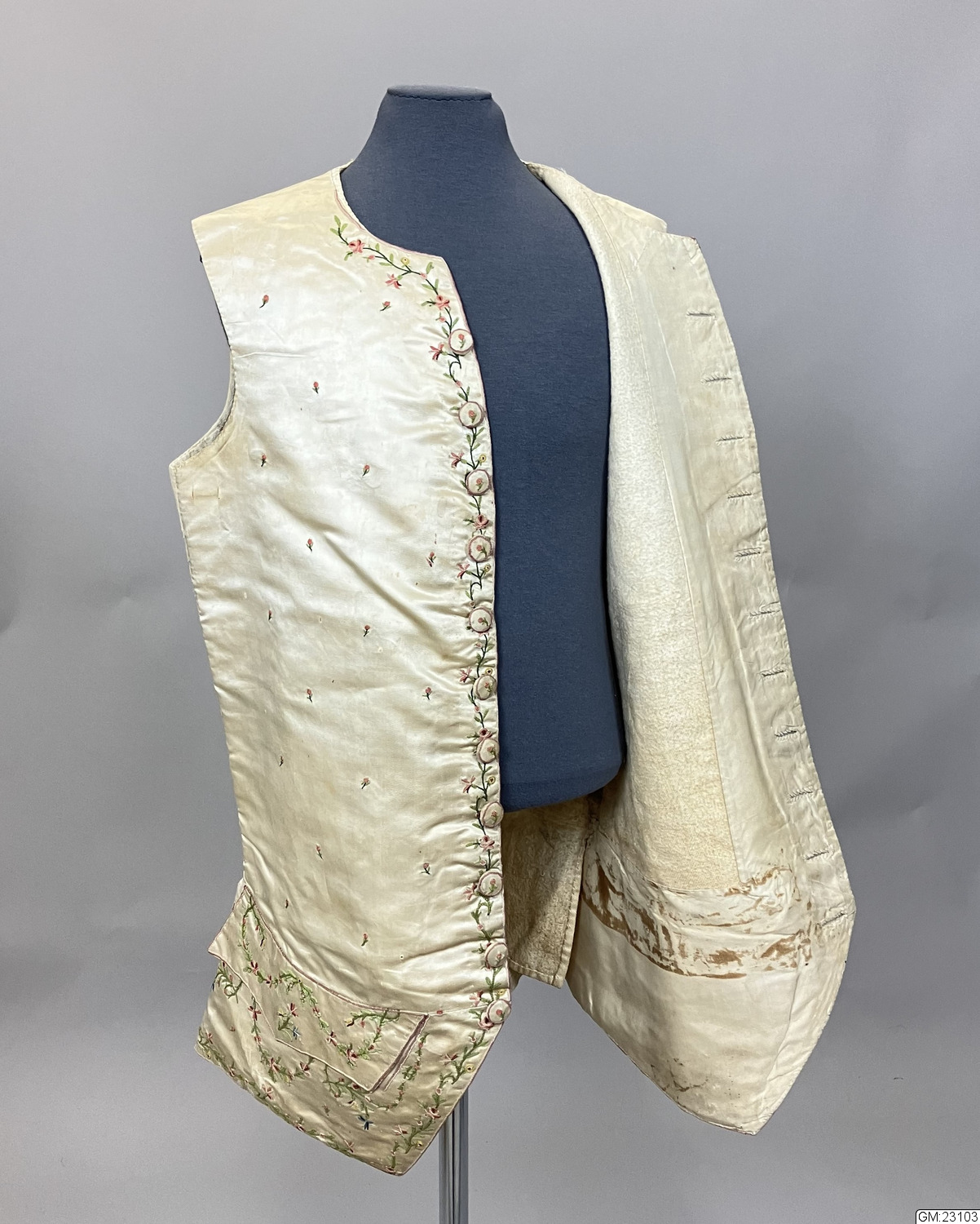 Herrväst i broderad gräddvit sidensatin. Skuren i två framstycken med kilar i siden vid axlarna. Fodrad med siden och bomull /linne-kypert där bomullssidan som ligger inåt är ruggad för behaglig yta. Knäppning mitt fram med 11 klädda och broderade knapper. Framstyckena är svängda och skörtet snedskurna utåt sidorna. Två fickor med treuddiga broderade lock. Västen är broderad (troligen i tambursöm) i huvudsakligen röda och gröna nyanser men även inslag av gult och blått. Troligen broderat på kupong (dvs. tyget är broderat för väst i okänd storlek på broderifirma och sedan anpassat hos skräddaren efter kundens mått). Motivet är blomrankor runt hals, framkant, nederkant, fickor och ficklock och små blomknoppar spridda över framstyckena. Ryggen i ensidig bomull/linne-flanell med den släta sidan utåt är öppen mitt bak. Den knytes ihop med 3 par enkla bomullsband. Västen har även kilar i vardera sidan i bomull/linne-kypert med flanellsidan utåt.